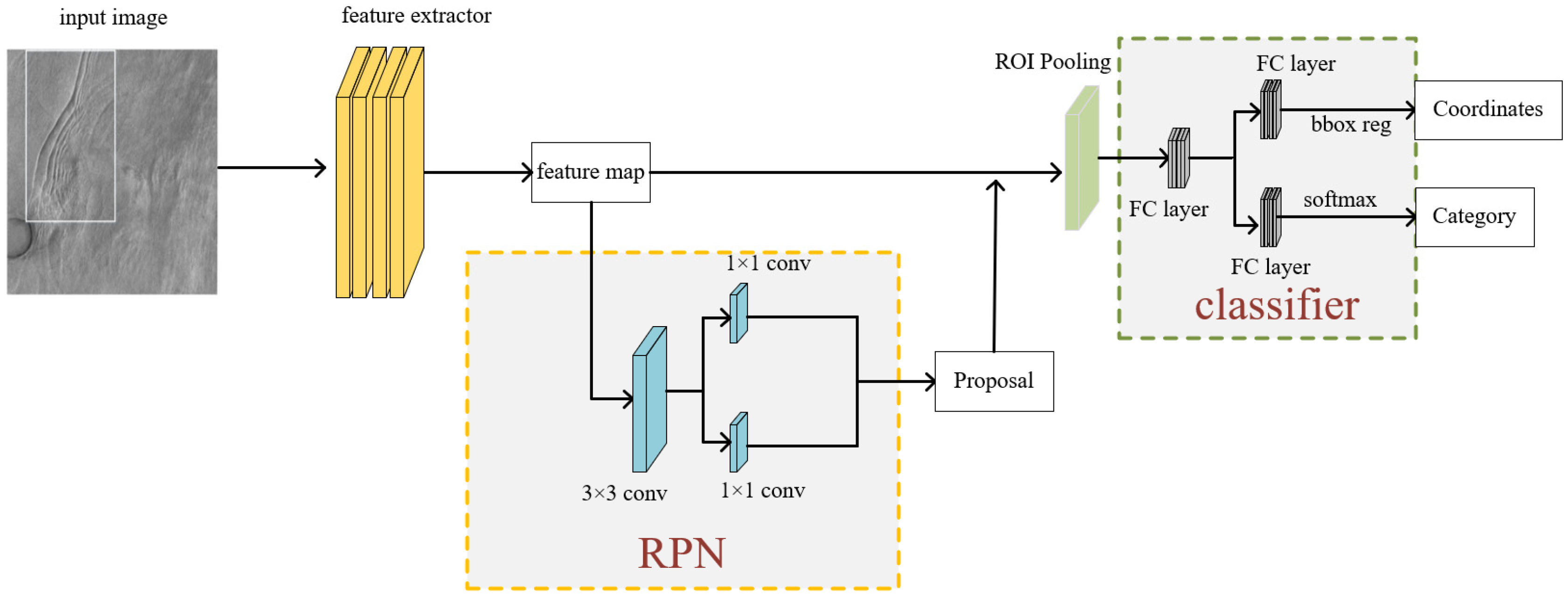 The Faster R-CNN architecture consists of four main components: a feature extractor, an RPN, an ROI Pooling layer, and a classifier, as illustrated in