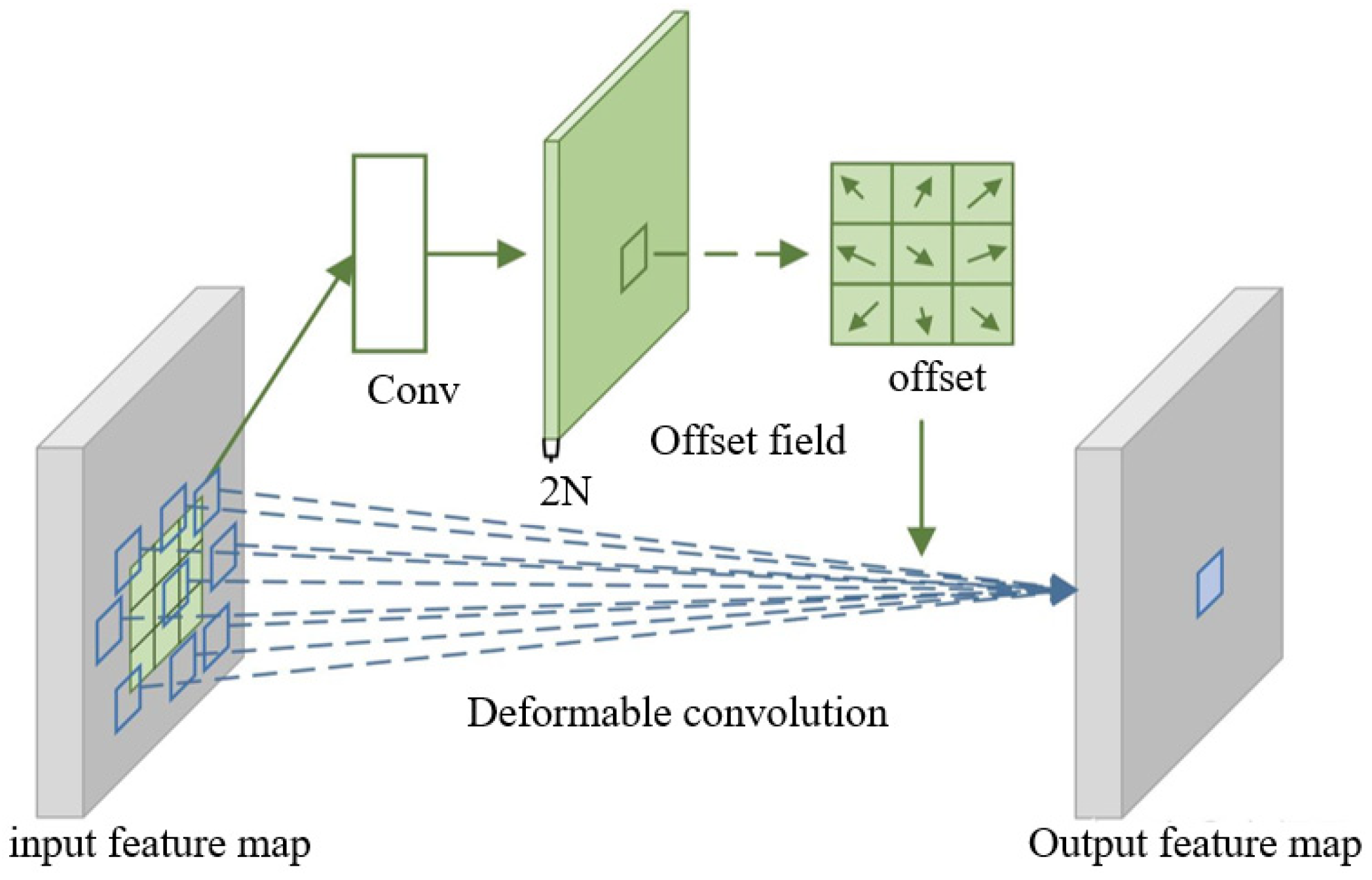 19], aiming to improve the convolutional neural network’s adaptability to geometric transformations of objects. Unlike standard convolution that samples feature from fixed spatial positions, deformable convolution introduces learnable offsets on top of the standard sampling grid. These offsets allow the sampling locations of the convolutional kernel to be dynamically adjusted based on the input features, thereby enabling the network to more effectively capture local structure variations and deformation patterns in the image, as illustrated in