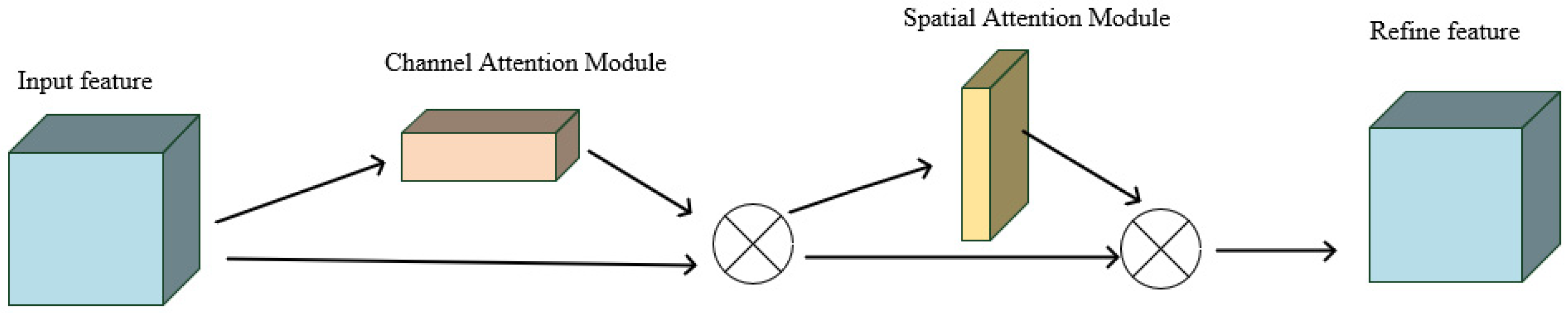 In this module, the input feature map first passes through a Channel Attention Module, which adaptively adjusts the feature response weights based on the importance of each channel, thereby enhancing the representation of critical channel information. Subsequently, a Spatial Attention Module is applied to focus on key spatial regions within the feature map, improving the model’s attention to salient object locations.