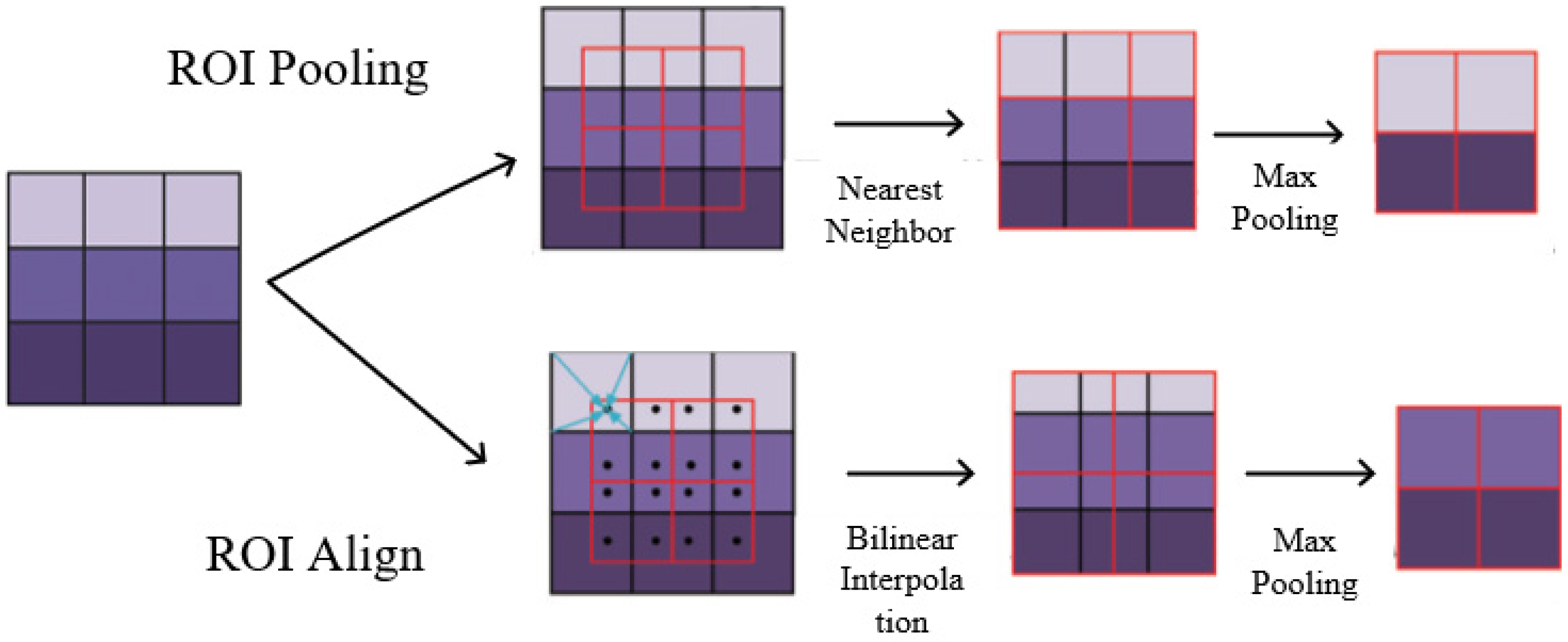 Figure 9 illustrates the differences between ROI Pooling and ROI Align. The upper panel presents the traditional ROI Pooling process, where regions are divided after coordinate quantization followed by max pooling, which may lead to feature misalignment. In contrast, the lower panel shows ROI Align, which preserves floating-point coordinate precision and applies bilinear interpolation to extract features more accurately within candidate regions, thereby enhancing overall detection performance.
