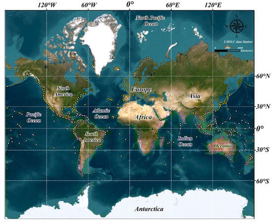 The University of Hawaii Sea Level Center (UHSLC) was established in the 1970s by Prof. Klaus Wyrtki to investigate El Niño and has since become an important component of the Global Sea Level Observing System (GLOSS) [33]. UHSLC provides research-quality hourly sea-level records and applies standardized processing, including removal of benchmark drift and correction of clock errors, to ensure the accuracy of the data for long-term climate studies. In this study, we use the research-quality datasets provided by UHSLC, which are further processed and then used as input to the ensemble-learning framework. After data screening and organization, records from 528 tide-gauge stations worldwide are retained; the locations of these stations are shown in Figure 1. The UHSLC data were obtained from: https://uhslc.soest.hawaii.edu/data (accessed on 30 September 2025).