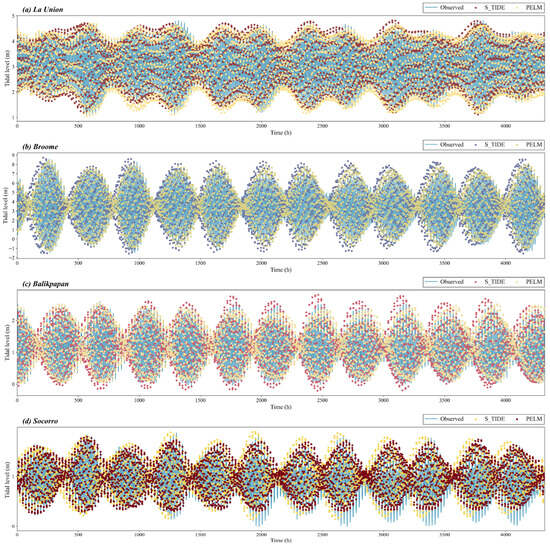 For the 56 stations where the physical-tide RMSE exceeds 0.6 m, the statistics are summarized in Table 6. All of these stations exhibit positive improvement, with a maximum improvement of 77% and a minimum of at least 27%. The table shows that stations with pronounced improvement (improvement ≥ 65%) share two characteristics: (1) the physical-tide errors are large, with a mean physical-tide RMSE of about 0.89 m; and (2) while substantially reducing the errors, the PELM tide also avoids overfitting, yielding a mean PELM RMSE of 0.25 m. Across the 56 stations, ΔRMSE ranges from 0.36 to 0.82 m, and most improvement ratios fall in the range 55–65%. Example comparisons of tidal elevations at a subset of these stations are shown in Figure 4, where stations with physical-tide RMSE > 0.6 m but different improvement levels are selected for illustration.