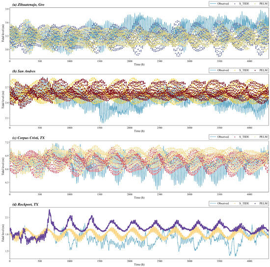 Based on the DM test results for all tide-gauge stations, summarized in Table 5, the proposed PELM exhibits a clear advantage at the majority of sites. Among the stations where PELM performs strongly, the mean improvement rate reaches 69%, with an average DM statistic of approximately −17. For the stations in Table 5 where no statistically significant difference is detected, three sites show a degradation in observational agreement after PELM correction, while six sites exhibit only marginal improvements (improvement rate < 10%). Only the Rockport, Texas, station yields a DM test outcome indicating that the pure S_TIDE scheme outperforms PELM. This result clearly indicates that, for most stations, the proposed PELM framework has broad applicability and is not limited to a single region or a specific local setting. A detailed analysis of this station is provided in the Section 5.