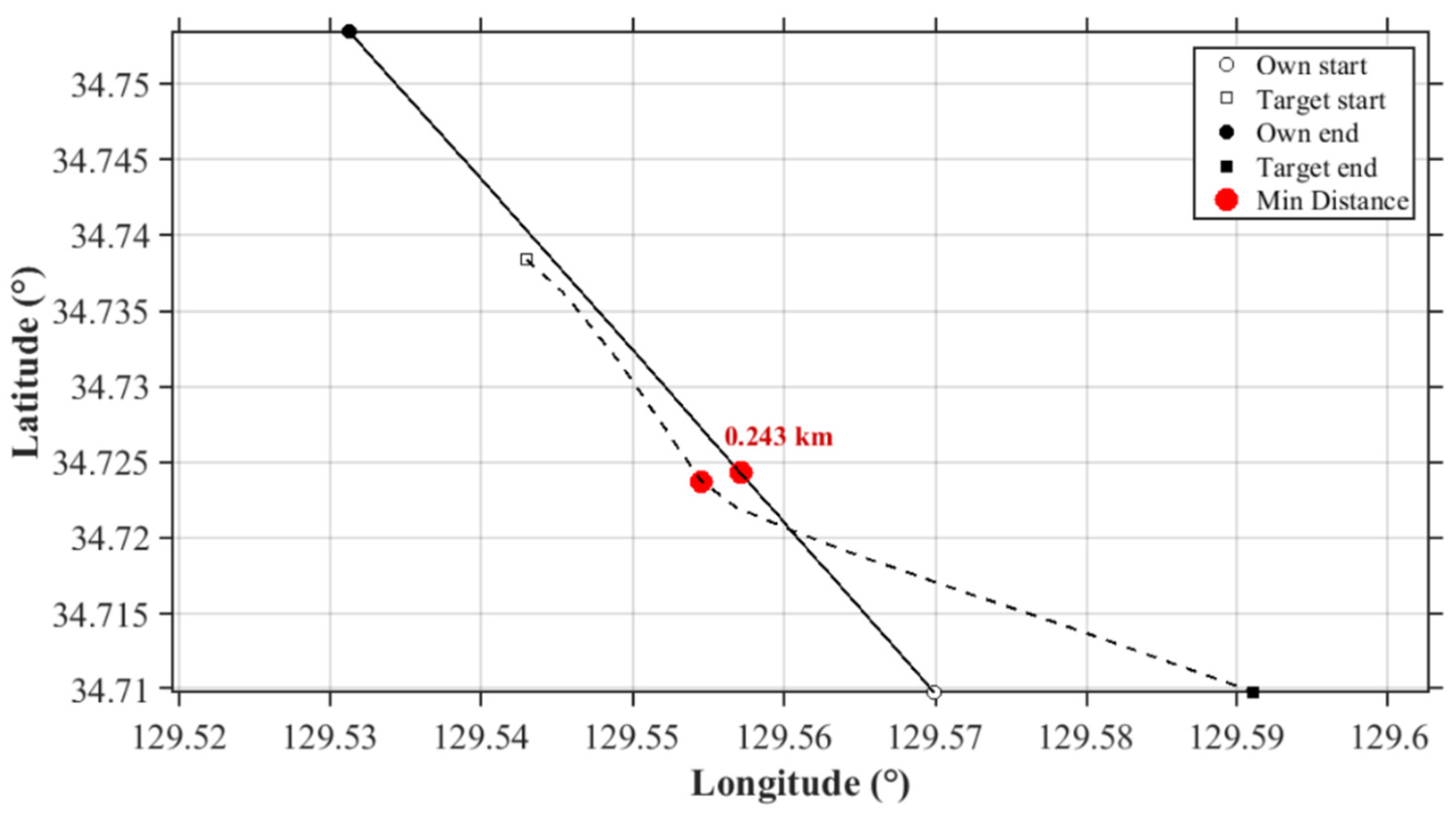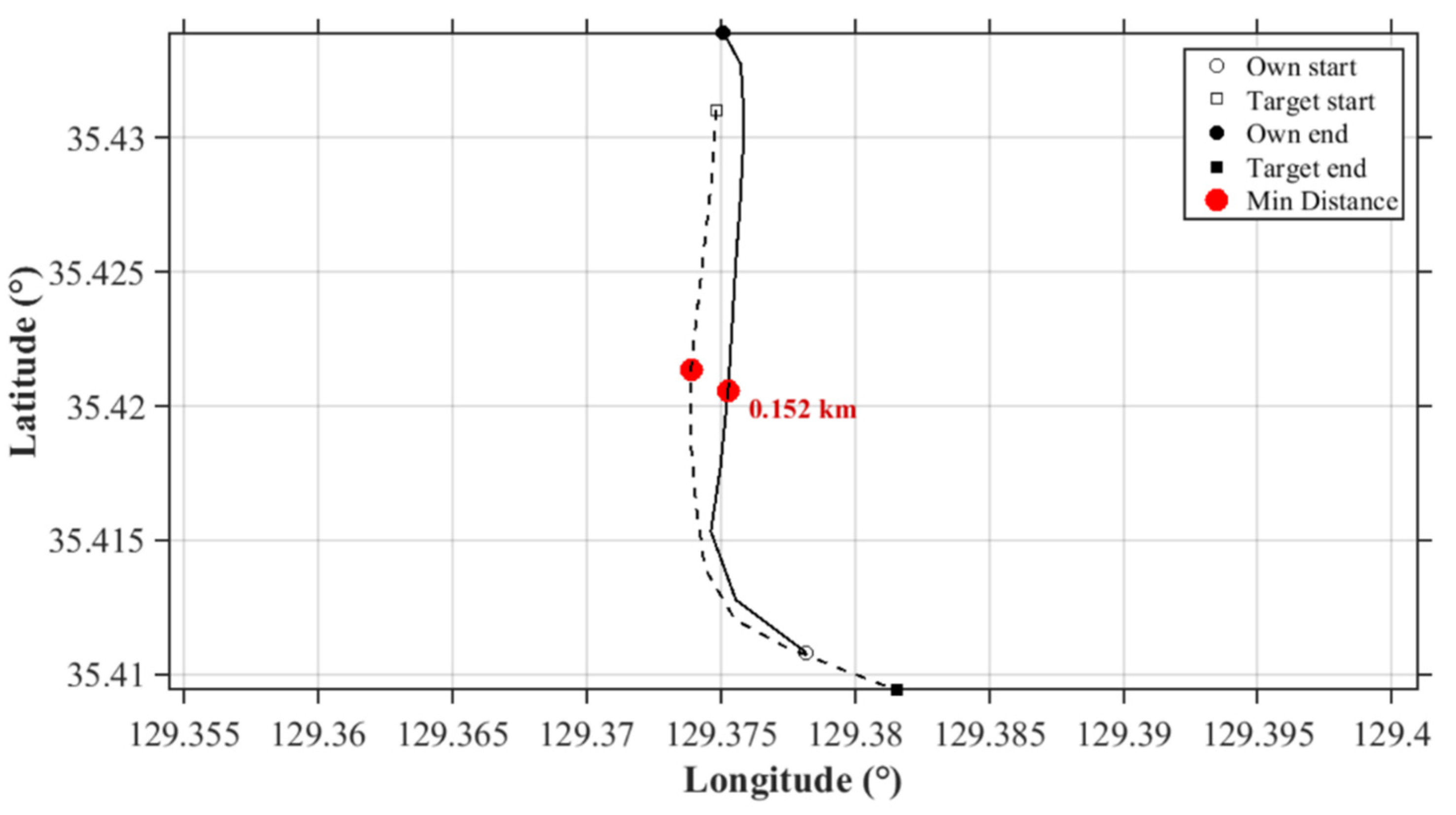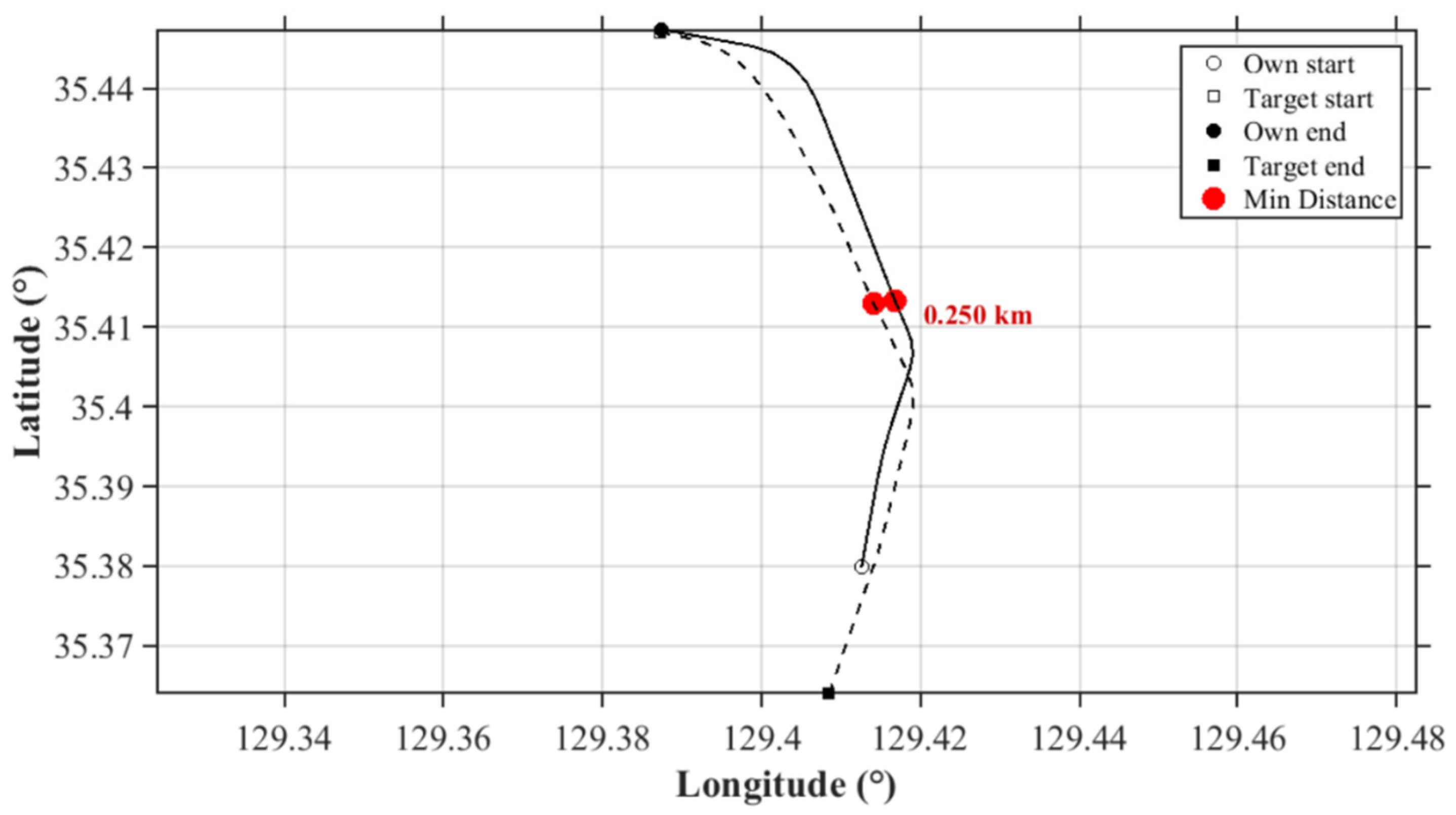 Figure 4. The own vessel (LOA 79 m), a general cargo ship, traveled at an average speed of 10.4 kt, while the target vessel (LOA 66 m) traveled at an average speed of 9.7 kt. Both vessels belonged to the general cargo category and therefore exhibited comparable maneuvering characteristics. Throughout the encounter, the own vessel maintained a relatively steady course, whereas the target vessel executed a starboard alteration to avoid collision.