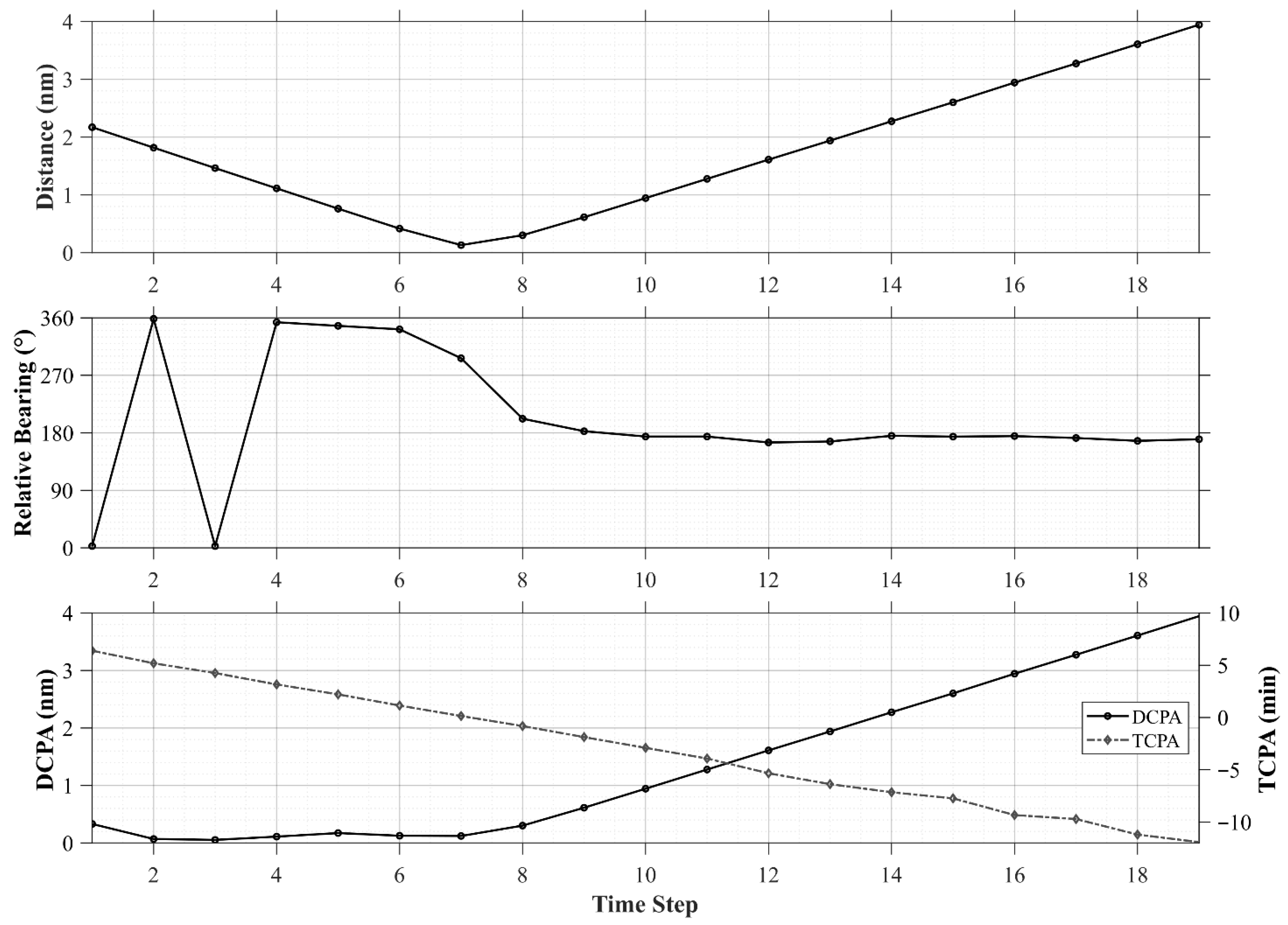 Figure 8 further highlight the geometric characteristics of a starboard-crossing encounter. The inter-vessel distance decreased sharply from 1.22 nm to 0.08 nm before increasing immediately thereafter, forming an asymmetric V-shaped pattern. The relative bearing began at 55.7°, shifted to 346.1° in response to the Own vessel’s alteration maneuver, and subsequently converged toward approximately 180° after passing, reflecting the canonical relative-motion structure of a starboard-crossing situation. Similarly, the DCPA steadily decreased from an initial value of 0.64 nm, indicating increasing proximity risk, while the TCPA decreased from approximately 4.19 min to zero and then turned negative, precisely marking the moment of minimum distance.