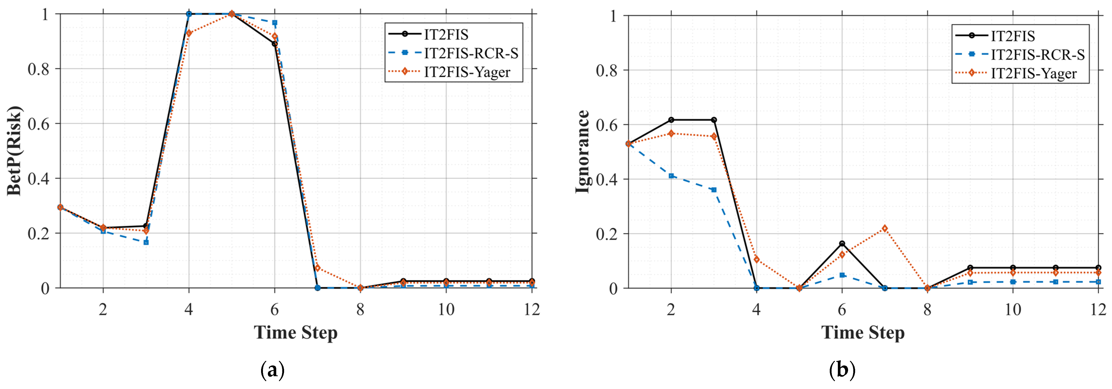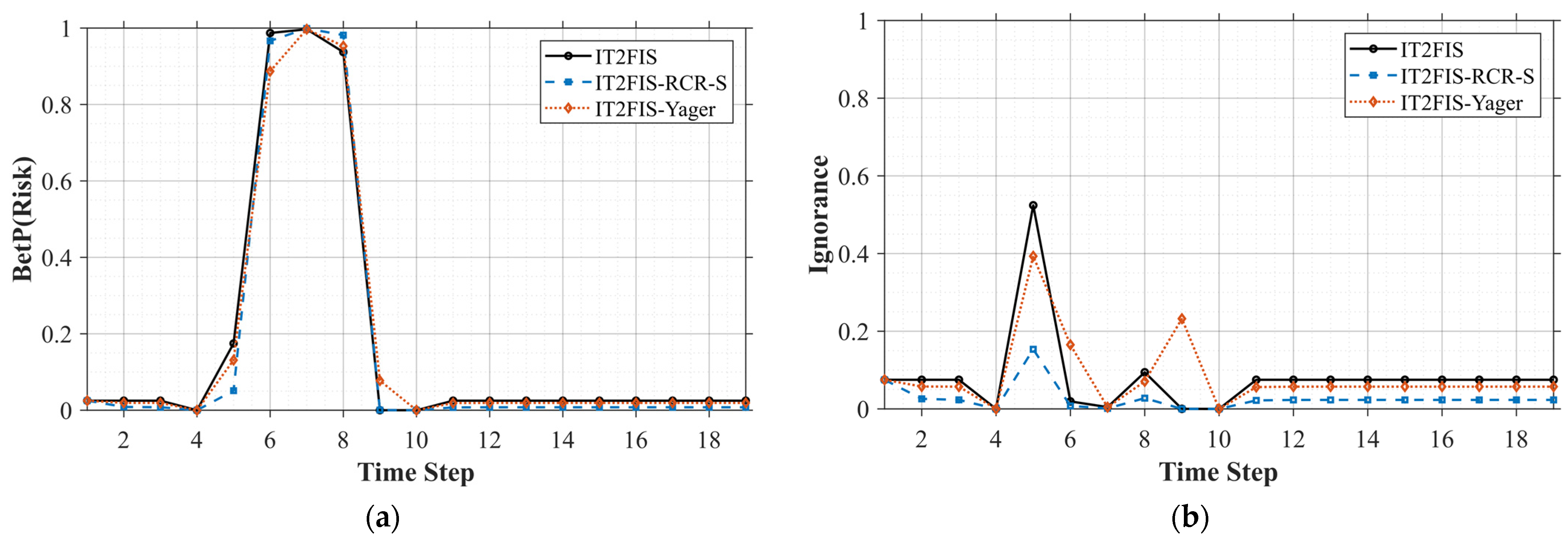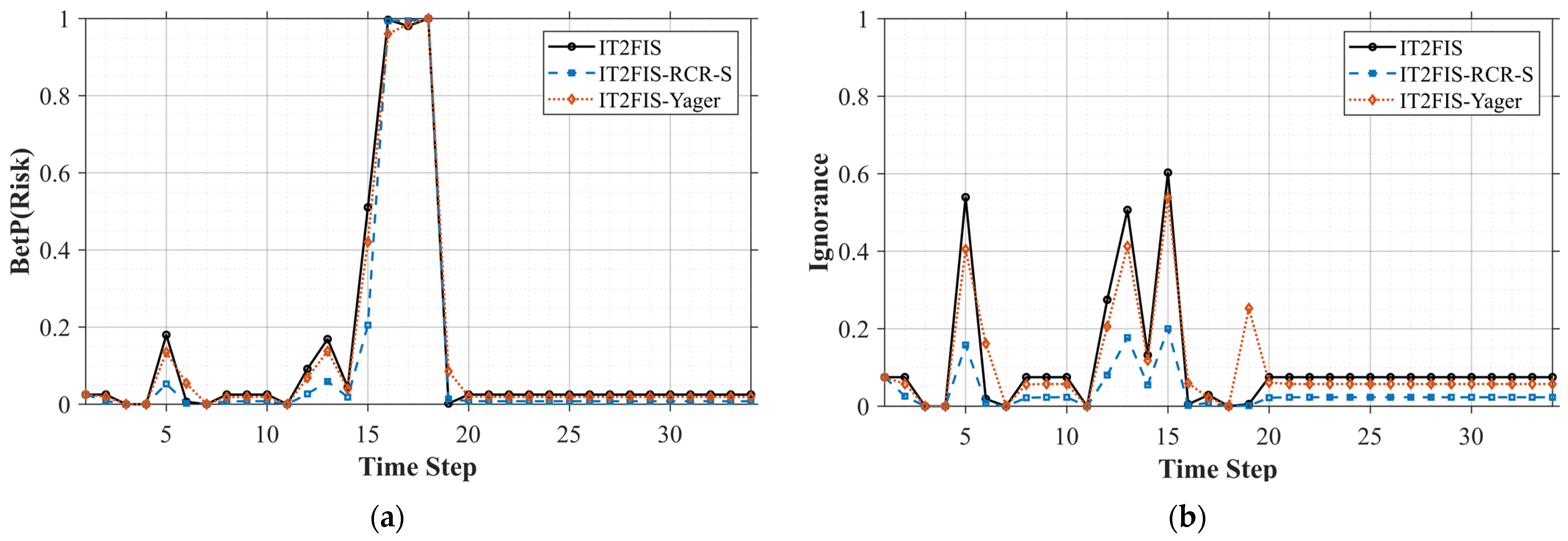 Figure 9b exhibits even more pronounced differences among the fusion strategies. During the initial phase (steps 1–3), both IT2FIS and IT2FIS–Yager show high ignorance values exceeding 0.5, reflecting substantial initial uncertainty, whereas IT2FIS–RCR-S maintains considerably lower values, indicating greater stability in accumulated evidence. When the risk signal becomes clearer (steps 3–5), all three strategies converge toward near-zero ignorance. After passing (steps 6–8), all methods display a renewed increase in uncertainty; however, IT2FIS–RCR-S shows the smallest rise and consistently maintains the lowest overall ignorance level. These results demonstrate that IT2FIS–RCR-S offers the most stable suppression of uncertainty across both pre-encounter and post-encounter phases.