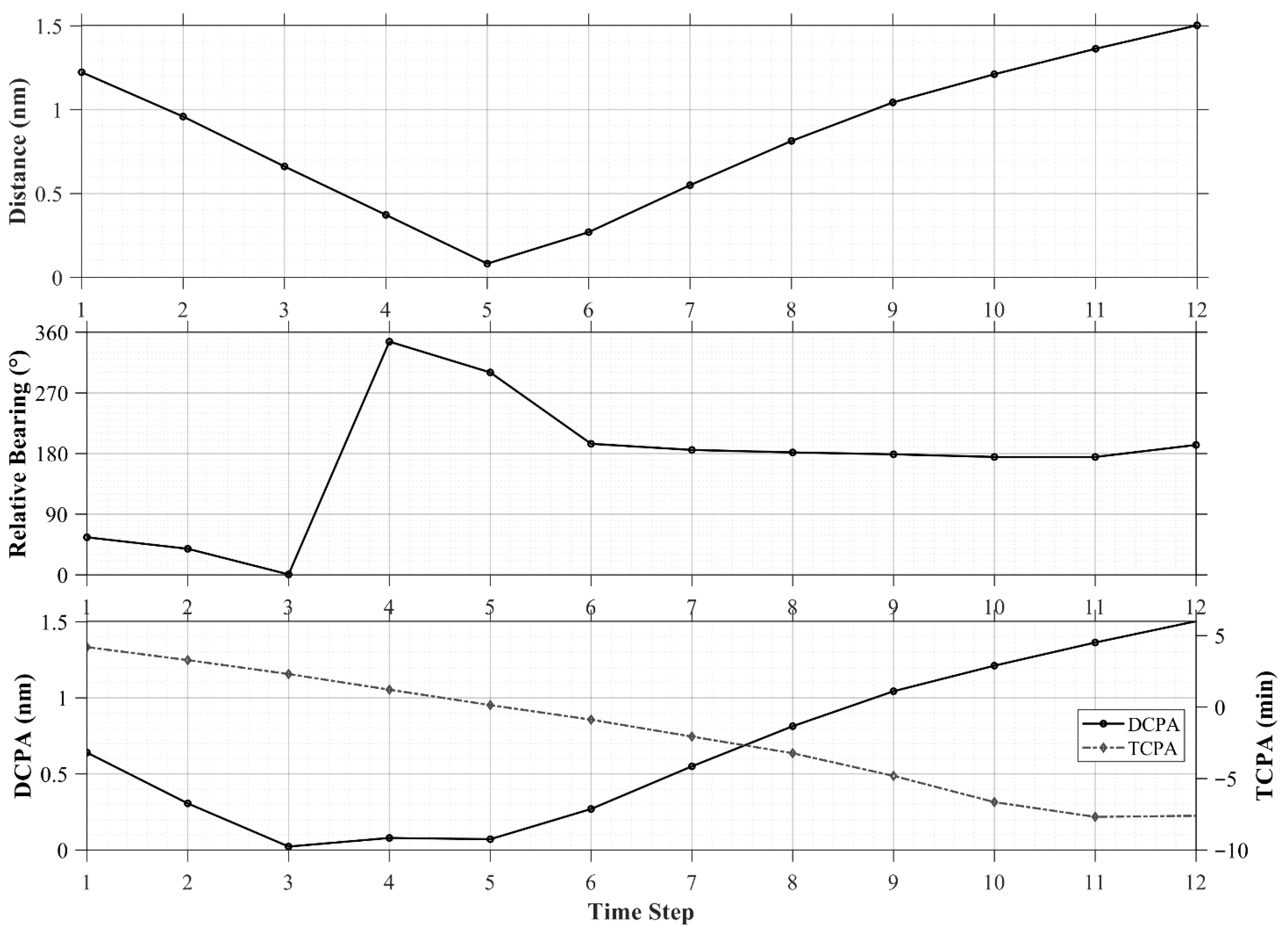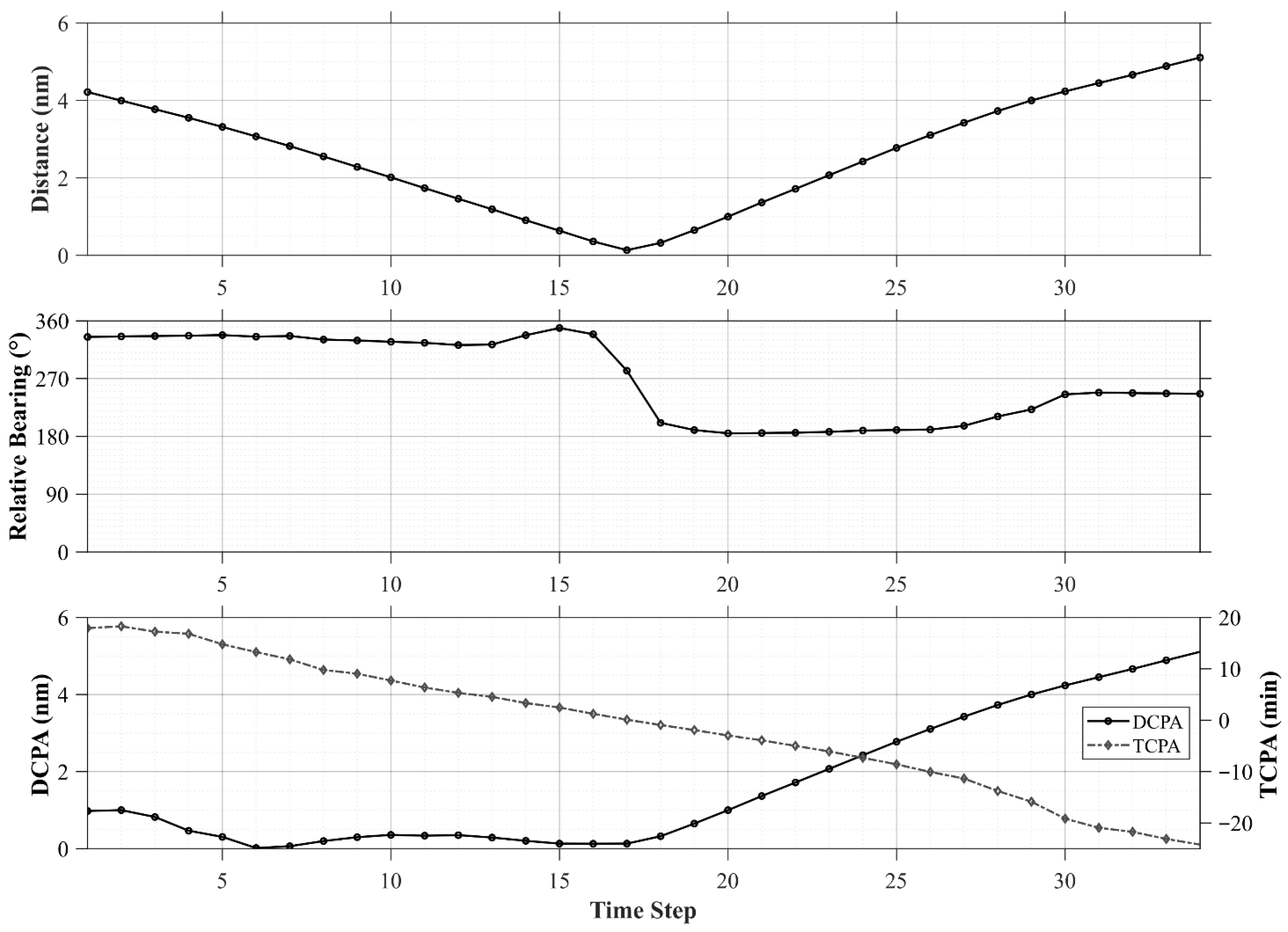 Figure 11 clearly capture the characteristics of this encounter. The distance gradually decreased from 4.22 nm to 0.14 nm before increasing again, depicting the approach–passing–separation sequence. The relative bearing began at approximately 334.9°, shifted rapidly during the approach phase, and converged to around 180° at the passing moment, accurately reflecting the geometric structure of a port-crossing situation. Additionally, the DCPA exhibited a long-term gradual decrease from an initial value of 0.98 nm, while the TCPA steadily declined from 17.92 min to zero before turning negative, indicating the relatively gradual evolution of this encounter.
