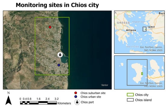 Figure 1. Map of Chios Island at the Northeastern Aegean Sea and Chios city with the port and the 2 monitoring sites (Urban and Suburban).