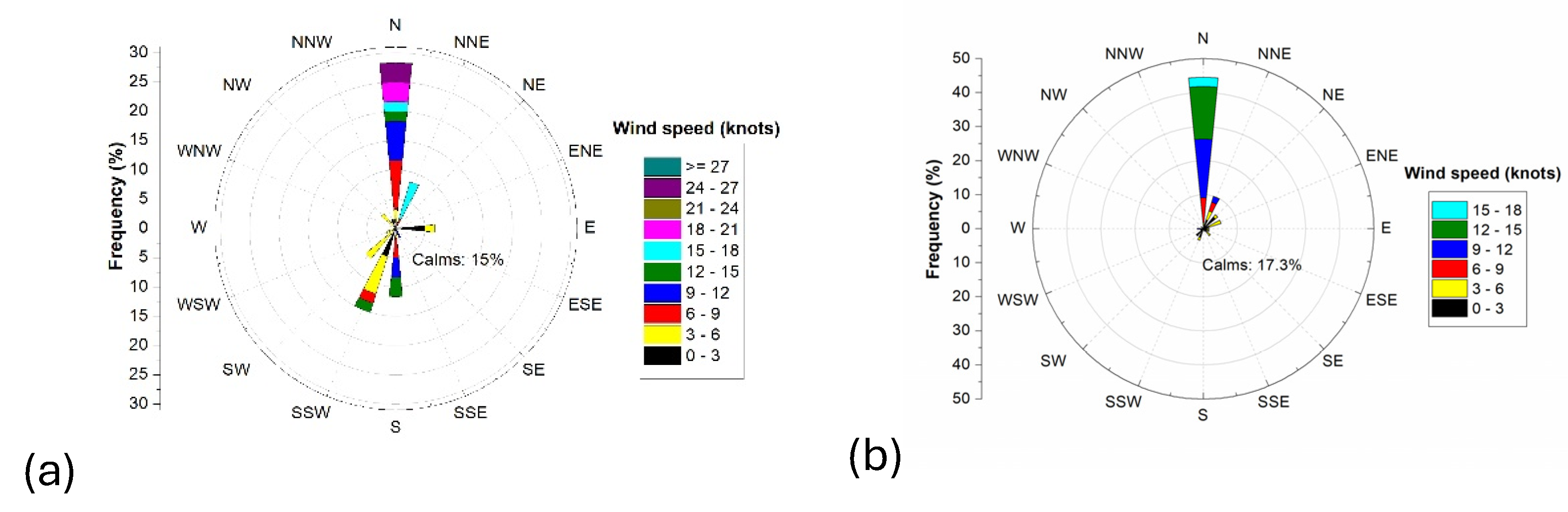 Figure 2. Wind roses in Chios for (a) February 2022, (b) August 2022.