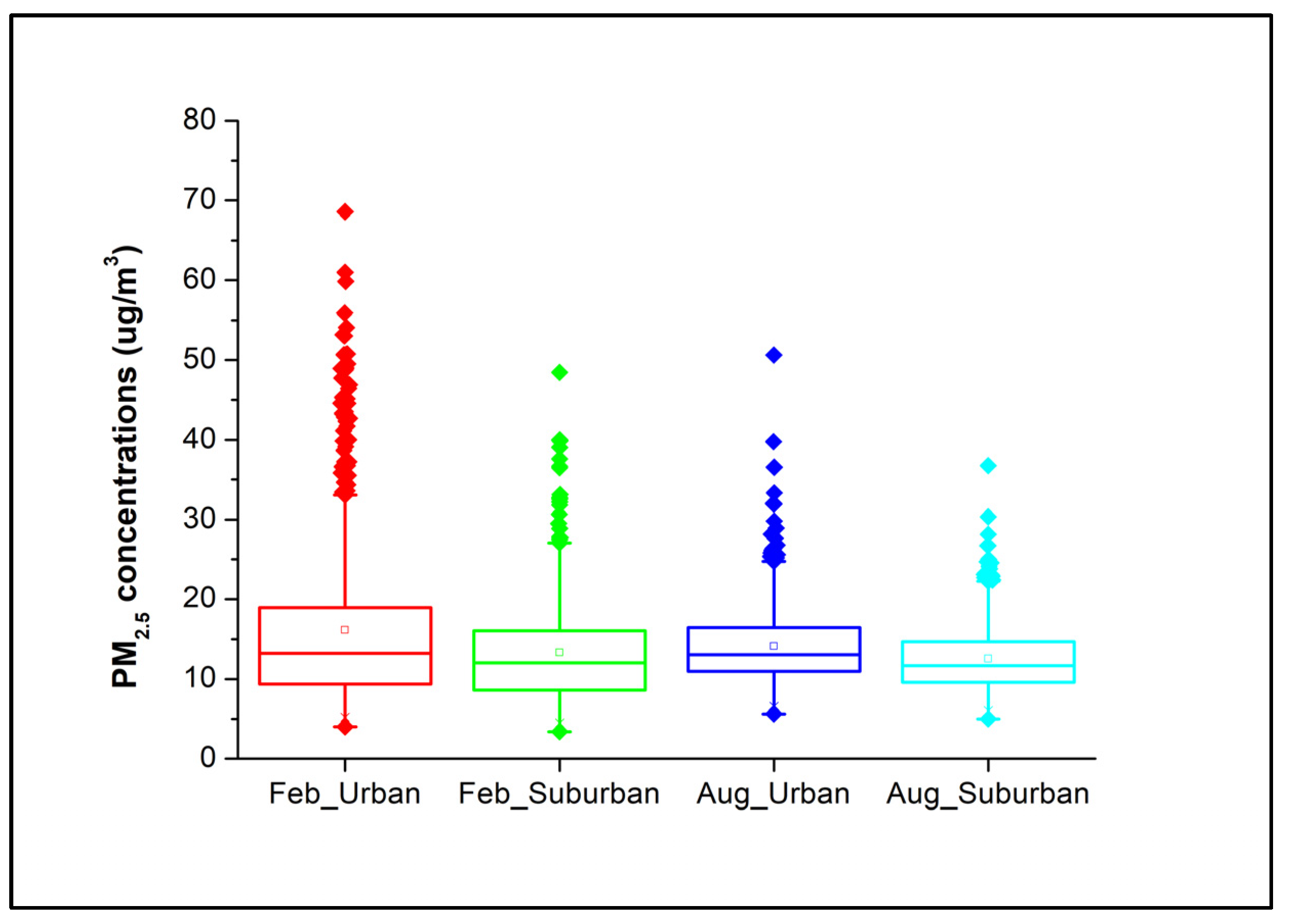 Figure 3. Boxplots of PM2.5 concentrations at the urban and suburban monitoring sites of Chios during February and August 2022.