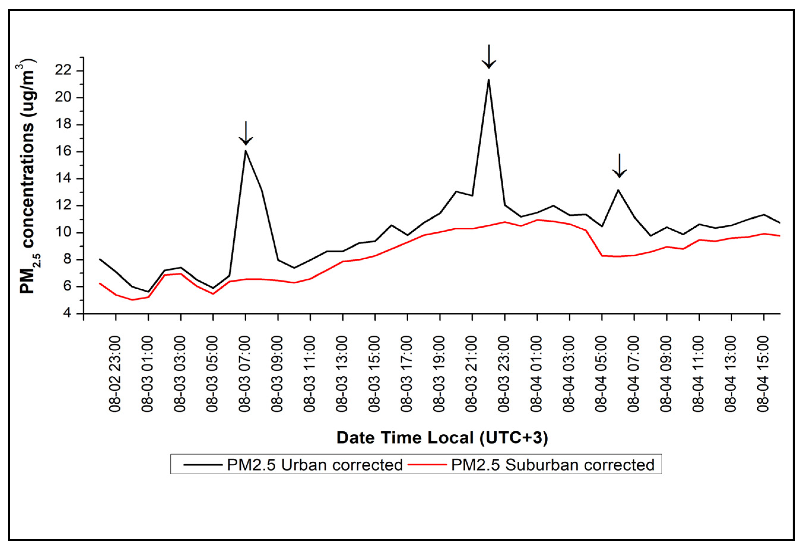 Figure 4. Time series of PM2.5 concentrations (in μg/m3) at the urban and suburban monitoring stations in Chios during 2 August–4 August 2022 (docking hours are marked with black arrows).