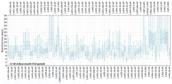 Boxplots of beaching time (days) for all simulated release positions during the JFMA period, corresponding to the four-month interval when the Intertropical Convergence Zone (ITCZ) is predominantly positioned in the Southern Hemisphere. Each boxplot represents the distribution of beaching times obtained from all probabilistic simulations initialized at each given spill location. The distribution highlights the spatial variability in coastal arrival times under ITCZ-dominated atmospheric conditions.