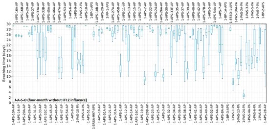 Boxplots of beaching time (days) for all simulated release positions during the JASO period, corresponding to the four-month interval when the ITCZ is displaced toward the Northern Hemisphere and its direct influence over the study area is reduced. Compared with the ITCZ-influenced period, the broader spread and generally longer beaching times reflect changes in wind direction that reduce onshore transport and increase variability in coastal arrival times.