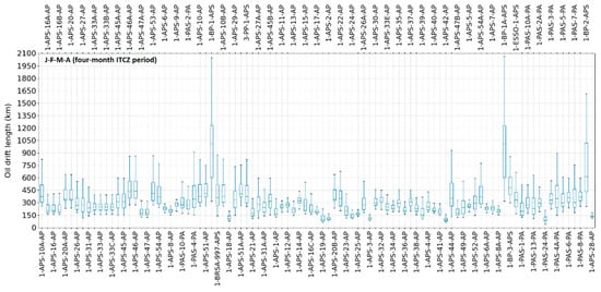 Boxplots of oil drift length (km) for all simulated release positions during the JFMA period, corresponding to the four-month interval when the ITCZ is predominantly positioned in the Southern Hemisphere. Each boxplot represents the distribution of oil drift lengths obtained from all probabilistic simulations initialized at each given spill location. The distribution highlights the low length variability under ITCZ-dominated atmospheric conditions.