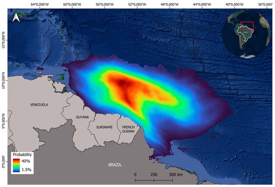 The Foz do Amazonas sedimentary basin stands as one of the most environmentally significant regions of the tropical Atlantic, hosting highly sensitive ecosystems and biodiversity hotspots. Prospective offshore oil exploration in this area raises substantial concerns due to the potential of severe environmental impacts as well as the possibility of transboundary incidents given the basin’s proximity to the Guyana–Suriname maritime frontier. Although previous studies have examined the Equatorial Margin as a broad system [48], they have not provided a focused, basin-scale assessment of spill behavior specifically for the Foz do Amazonas region, where circulation patterns, mesoscale activity and ecological vulnerability differ from adjacent sectors of the margin. In order to fill this gap, STFM v.1.0.3 (20250606) has been employed as the core modeling framework integrated into SISMOM [36,38]. STFM provides the computational efficiency required to perform a large number of probabilistic simulations (hundreds of thousands)—a key requirement for quantifying environmental risk in such a dynamic region—unlike Python-based models such as OpenDrift, which are typically limited to a few hundred runs due to computational constraints [47,48].