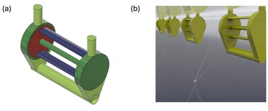 (a) Spar LiftWEC configuration: rotor-stator-spar floater assembly and (b) Spar LiftWEC array with mooring system.