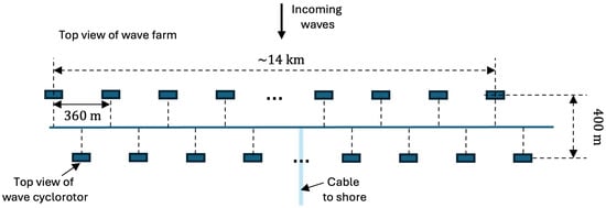 A top-view schematic of the proposed wave farm layout is shown in Figure 2. The diagram shows the spacing between devices and rows, the main bus with device connections indicated by dotted lines, and the main cable to shore. Note that in Figure 2, not all devices are shown due to symmetry of the diagram.