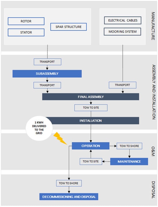 LCA is a standardized methodology for evaluating the environmental aspects and potential impacts associated with a product or system throughout its life cycle, from raw material extraction to end-of-life management. It supports decision-making by identifying environmental hotspots and enabling comparison of design alternatives. LCA is particularly valuable for benchmarking technologies from a multi-criteria perspective that considers environmental performance alongside technical and economic factors. The generic steps of the life cycle stages of a wave cycloidal rotor are visualised in Figure 3, as described in [16].