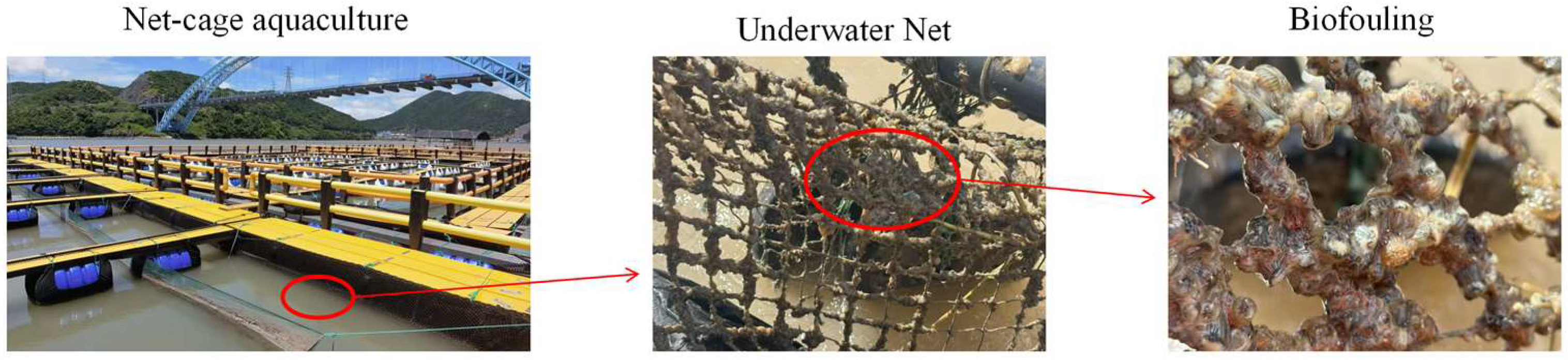 Net-cage aquaculture has become a key component of modern marine fisheries, enabling efficient utilization of coastal and offshore waters for large-scale fish production. However, biofouling organisms that accumulate on the net surfaces increase flow resistance and impose additional structural loads, as illustrated in