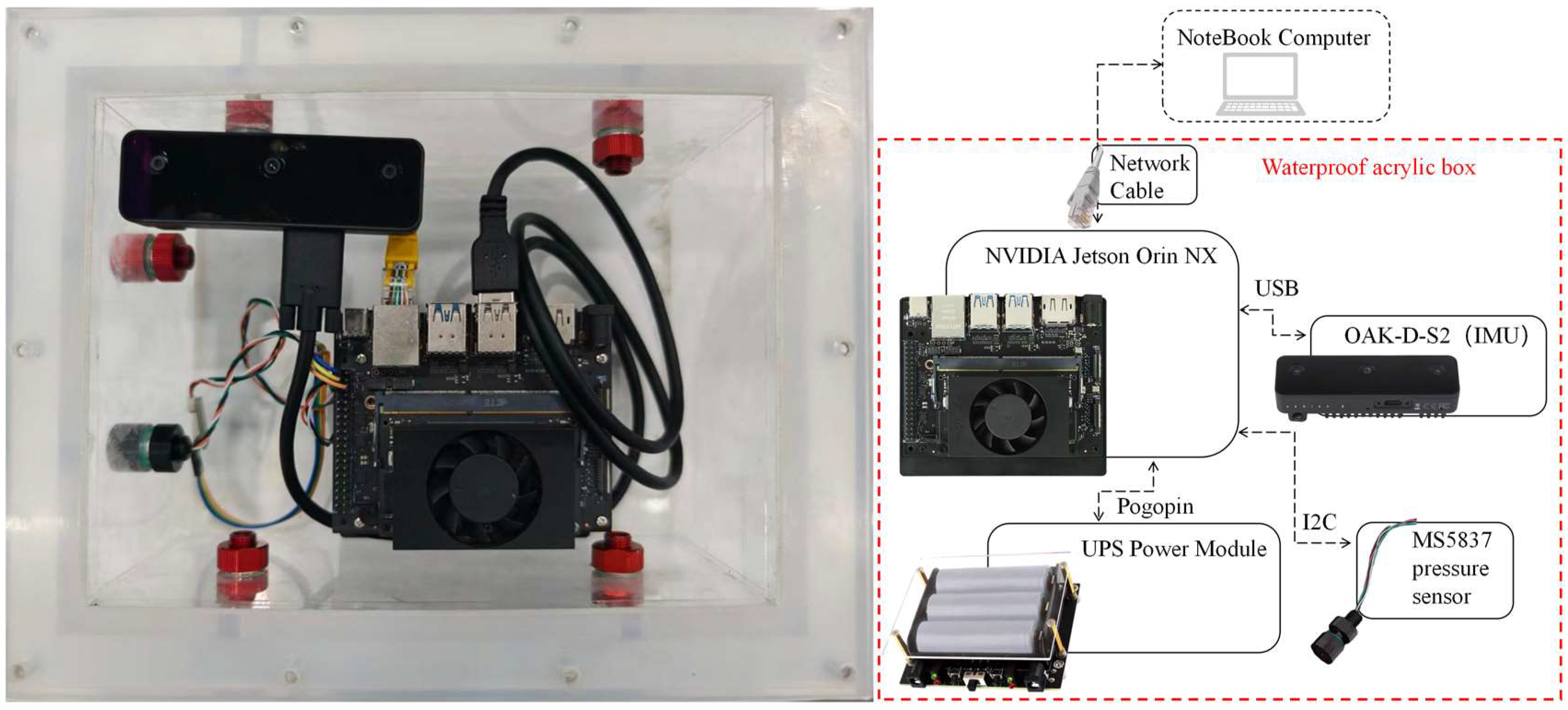 The sensor suite and embedded computer are encapsulated within an acrylic pressure-resistant housing to ensure waterproofing and long-term durability. The hardware configuration includes the following components: