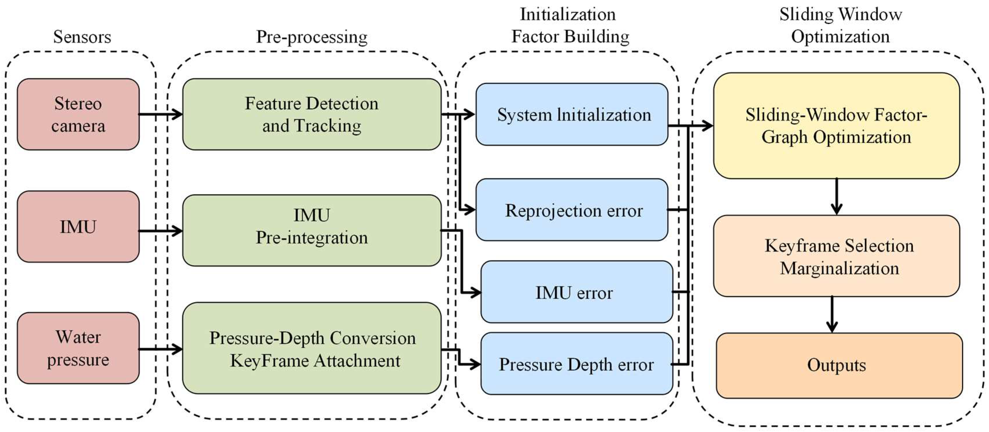 Figure 2. Built on the VINS-Fusion architecture, the proposed system integrates a pressure-based depth factor to enhance Z-axis observability and a reflective-anchor-assisted initialization strategy to achieve consistent world-frame alignment. Stereo vision provides metric scale and lateral accuracy, IMU pre-integration supplies high-frequency motion constraints, and the pressure sensor stabilizes vertical estimation. The framework operates in real time (~20 Hz) on a Jetson Orin NX embedded platform within the ROS environment, ensuring onboard computation and seamless integration for field deployment.