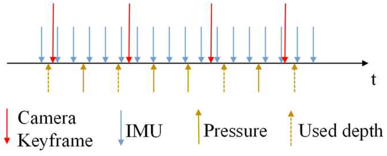 Depth readings associated with each keyframe are retrieved from the pressure-sensor buffer, where the closest measurement is selected (or interpolated if necessary). Schematic diagram of multi-sensor measurement are illustrated in