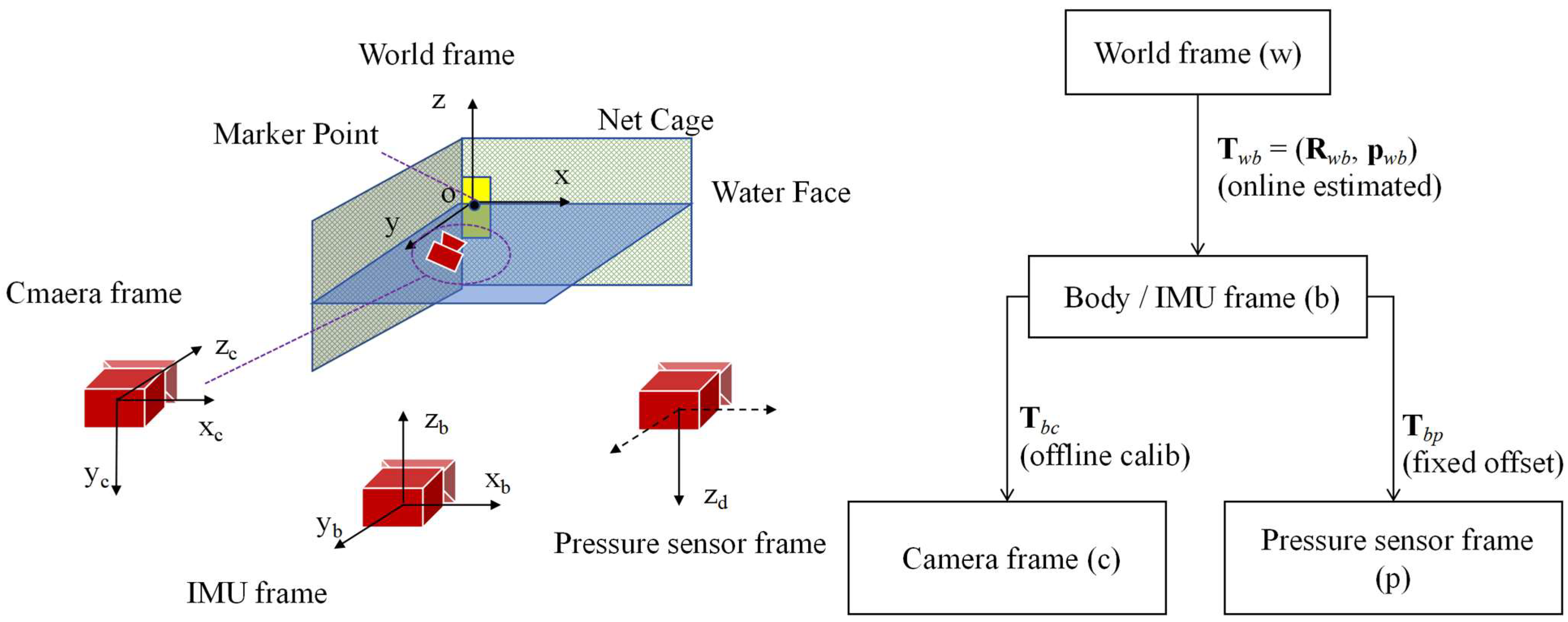 World frame (w): A fixed global reference frame defined by the pool cage environment. The reflective-marker anchor frame is aligned with the world frame during initialization. The known 3D coordinates of reflective markers are used to compute the camera pose relative to the anchor frame. At initialization, the reflective fiducial anchor center (marker point) is defined as the origin, with the horizontal plane aligned to the X–Y plane, the Z-axis pointing downward, and the X-axis defined according to the marker orientation. Once established, this frame remains fixed throughout operation.