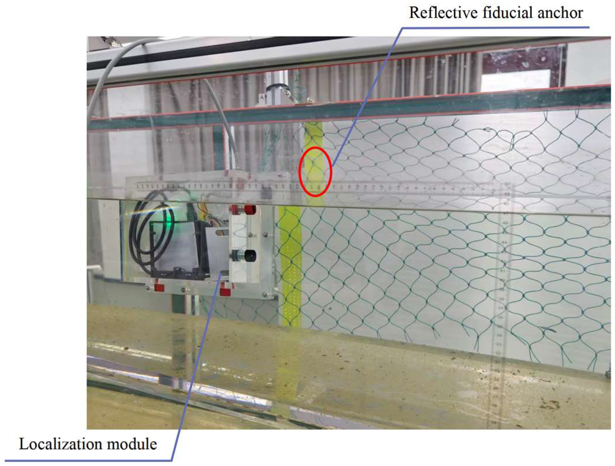 Initialization and anchor assistance: After deployment, the robot remains stationary for several seconds to collect IMU measurements and the current pressure reading. The mean accelerometer output is used to determine the gravity direction (setting the world Z-axis) and to roughly estimate the initial gyroscope and accelerometer biases. The initial pressure value is compared with a known surface reference to calculate a pressure offset. The robot is then maneuvered in front of a reflective fiducial anchor, and stereo ranging is used to measure its distance. The reflector is set as the origin, establishing the transformation between the camera frame and the net-cage coordinate system. The anchor is only used during initialization to align the global reference frame (attitude and position) and does not contribute residuals to optimization [