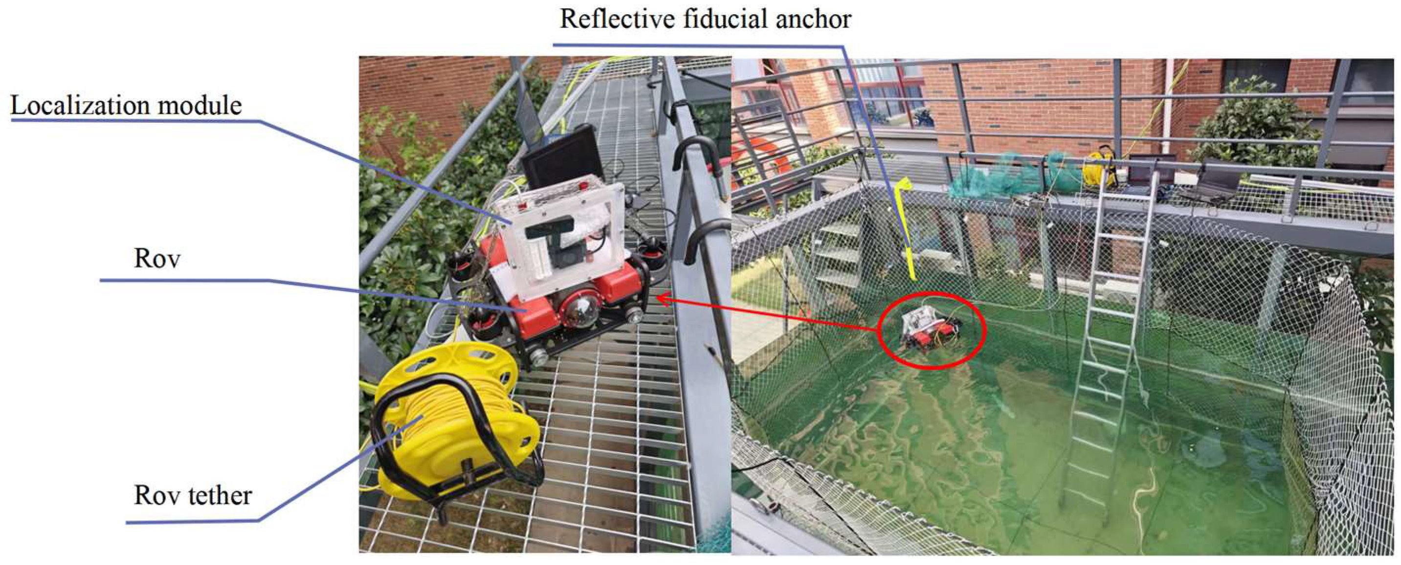 Figure 15b) followed identical motion patterns and observed the same set of reflective anchors, ensuring that any performance differences can be attributed primarily to the change in medium (air versus water). The ROV-mounted experiments carried out in the outdoor pool (