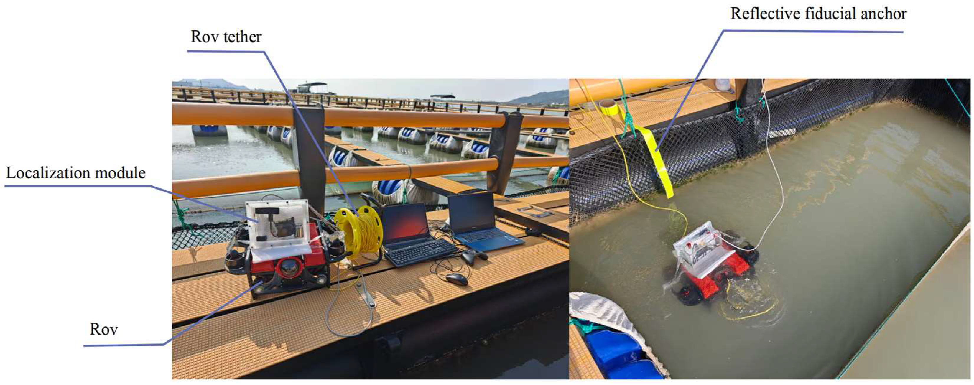 Future work will focus on extending field trials to full-scale sea cages for long-term evaluation; developing lightweight and adaptive fusion algorithms to down-weight unreliable visual cues; introducing LED beacons or active anchors for improved performance under weak textures; and integrating the method with crawler-based cleaning robots equipped with cage-gripping mechanisms to counteract current-induced displacement. Additional improvements targeting initialization stability, bubble mitigation, and optical clarity will further enhance the system’s resilience.