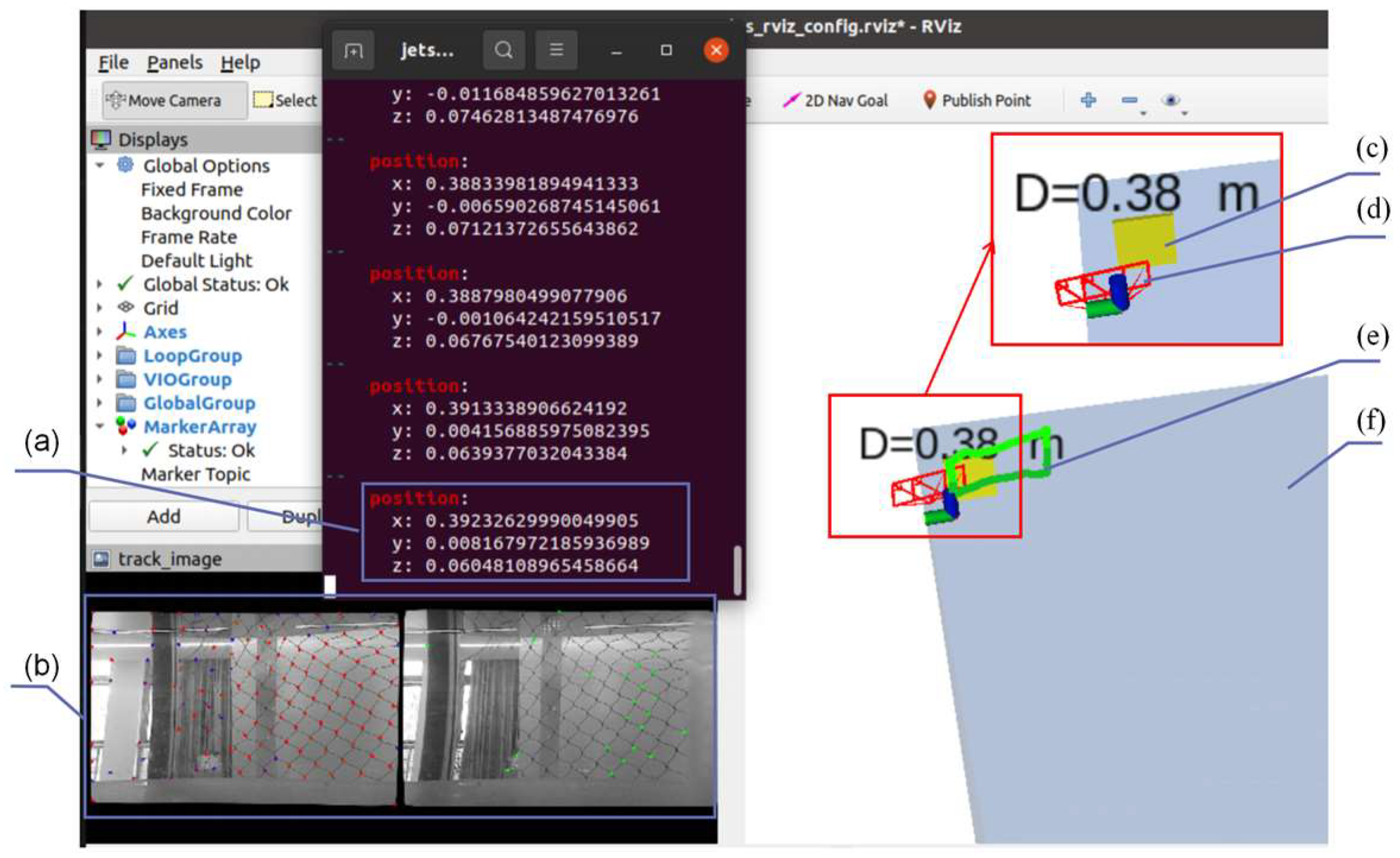 During all experiments, the proposed localization system ran continuously on the Jetson Orin NX at approximately 20 Hz. Data collection included stereo images (20 Hz), IMU measurements (100 Hz), pressure readings (20 Hz), and the robot’s estimated trajectory and 3D spatial positions, all recorded in ROS bag files. The system produced real-time pose estimates used for analysis and shown in RViz.