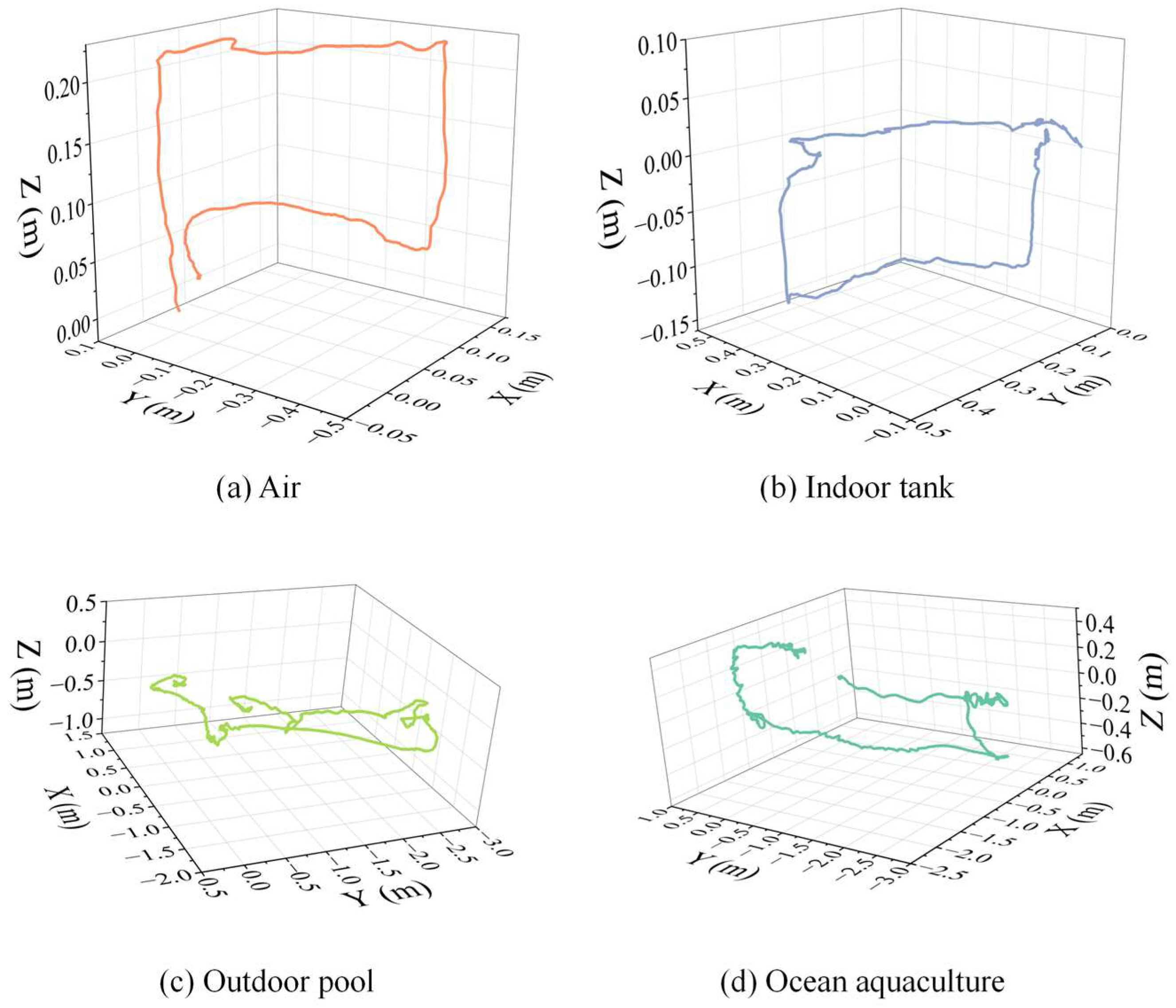 Figure 15 shows that as the environment transitions from air to tank to outdoor pool and finally to open-sea conditions, trajectory smoothness and closure gradually degrade, yet remain interpretable and traceable to identifiable environmental causes.