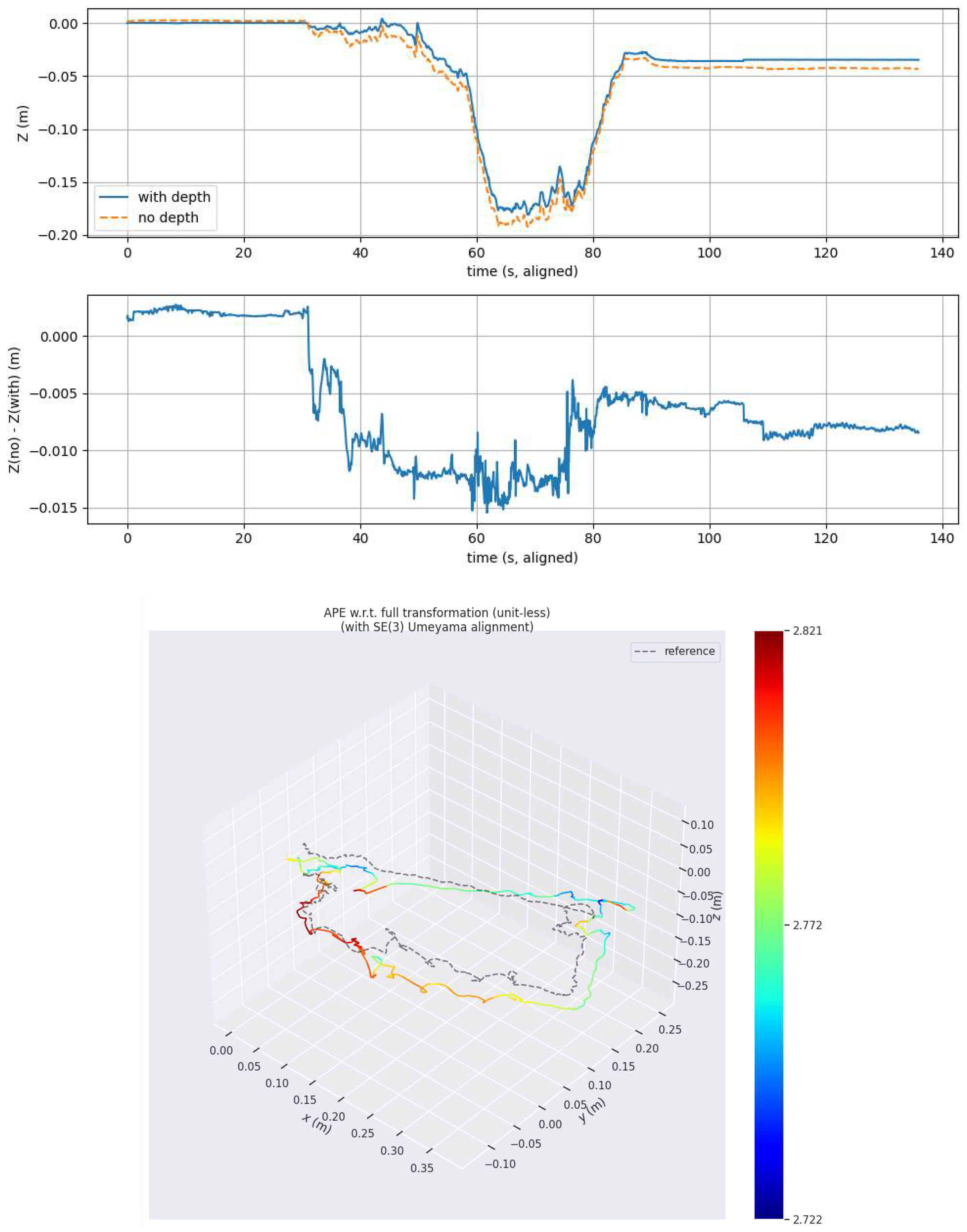 Figure 16, the benefit of the depth factor in this setting is modest but consistent, indicating that while visual–inertial cues dominate in clear conditions, depth sensing provides an additional stabilizing constraint.