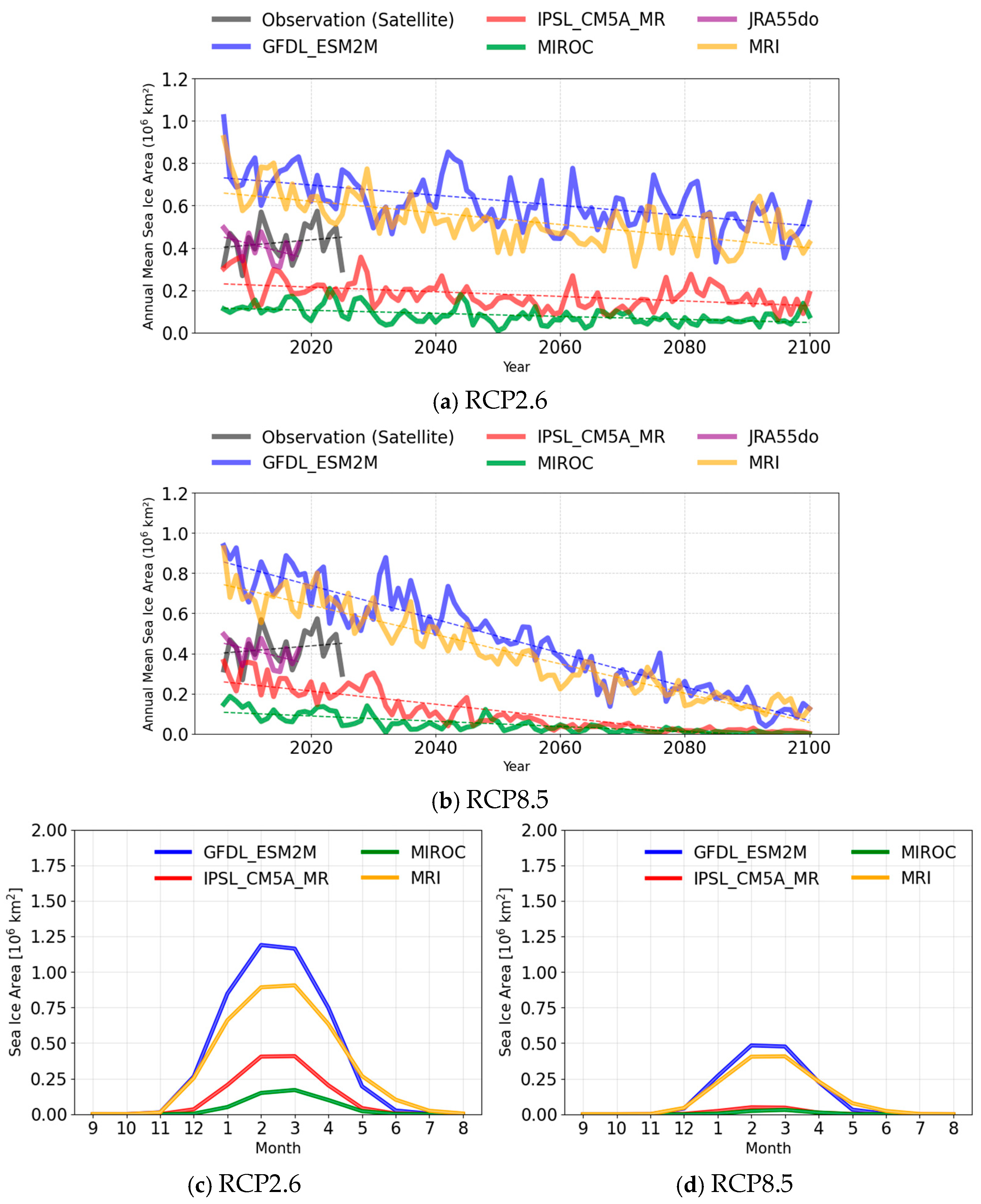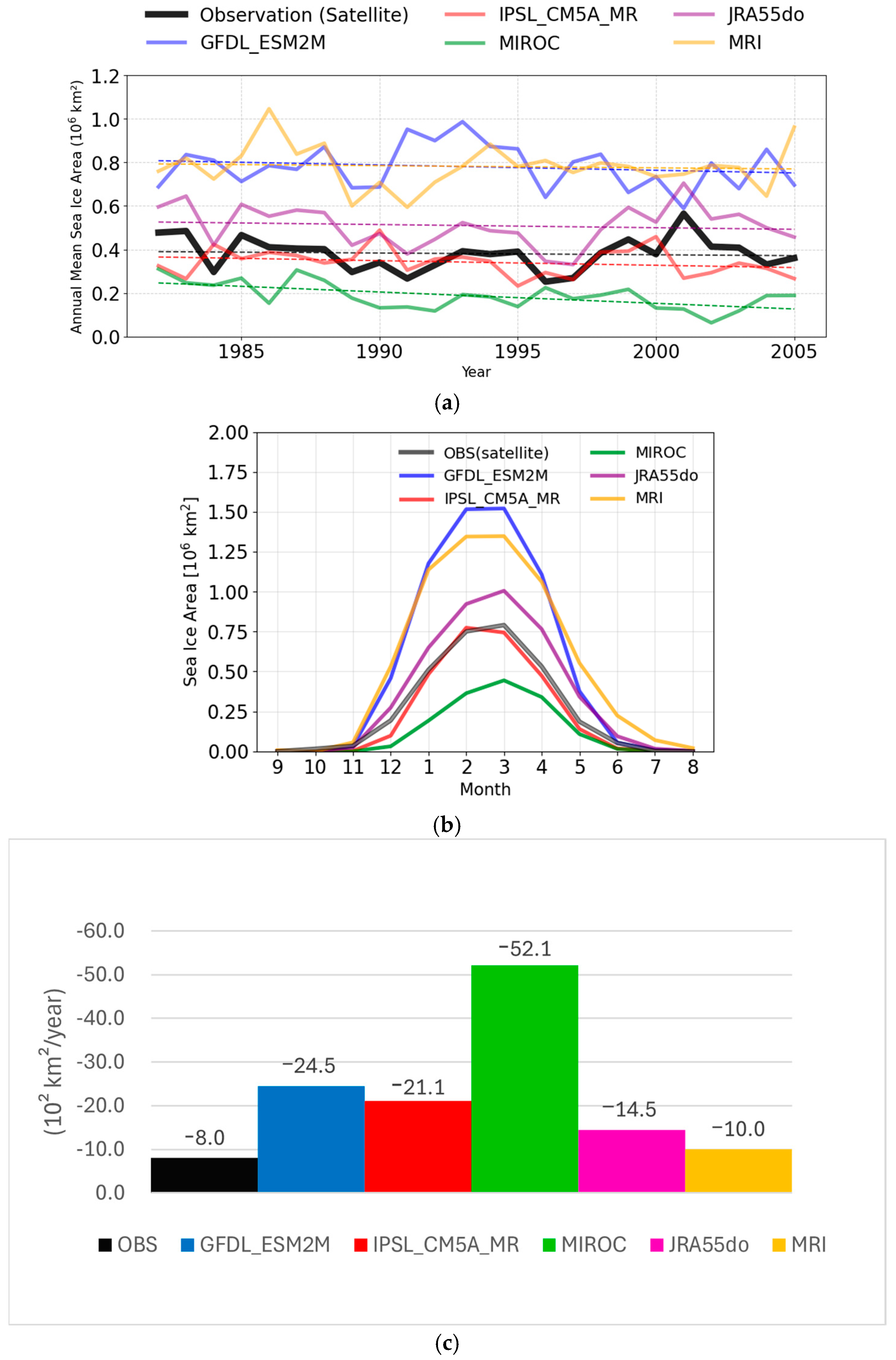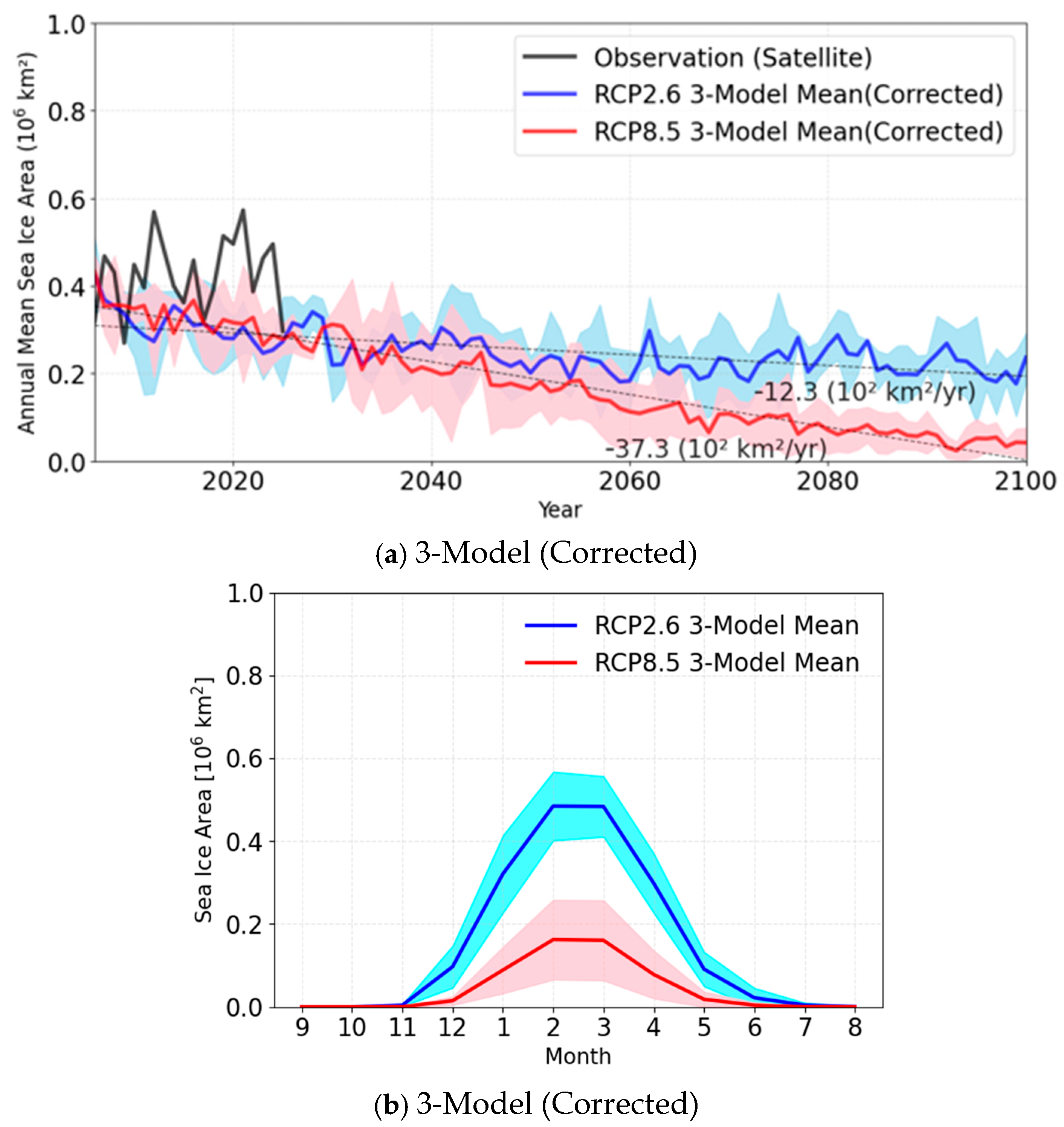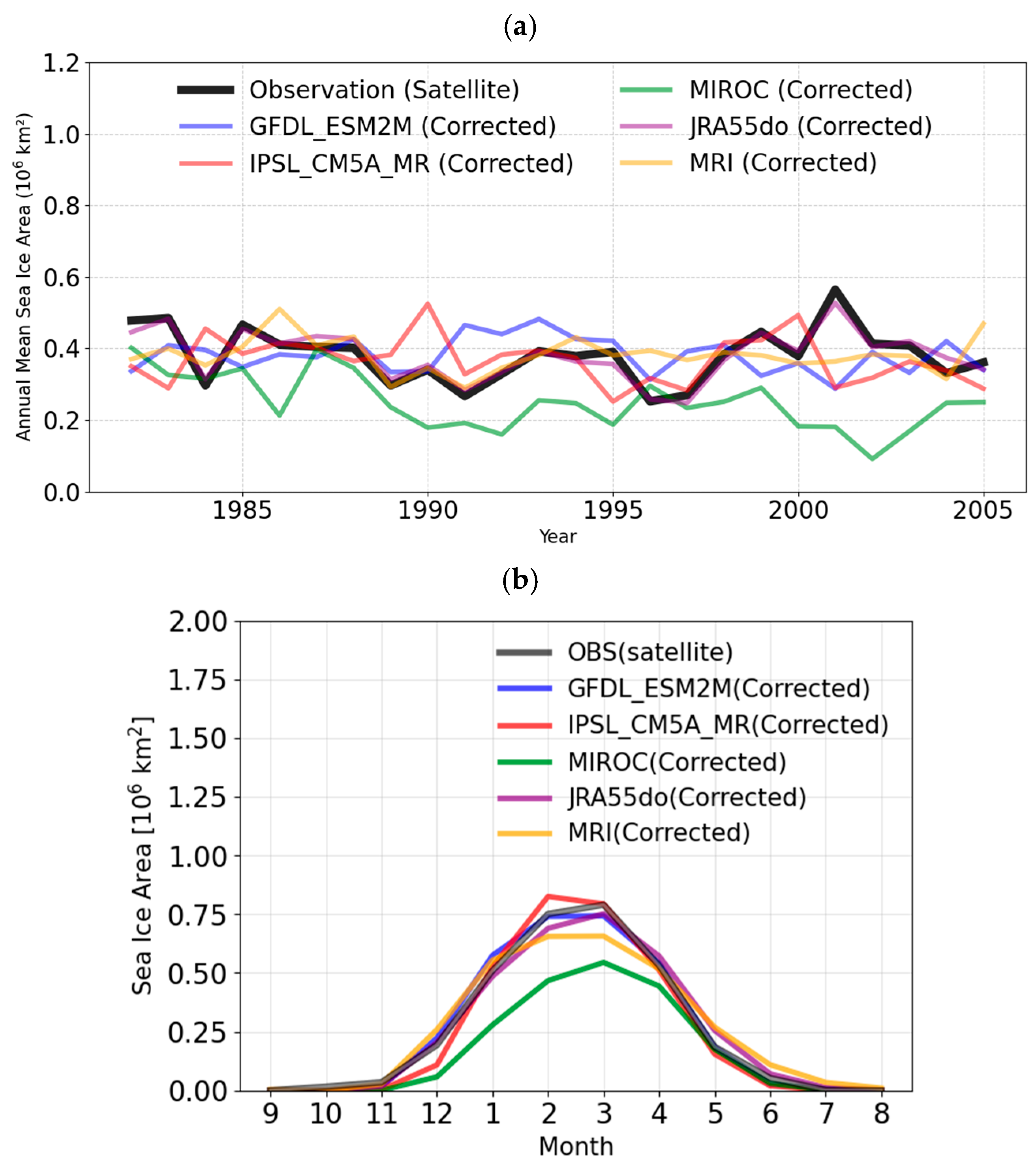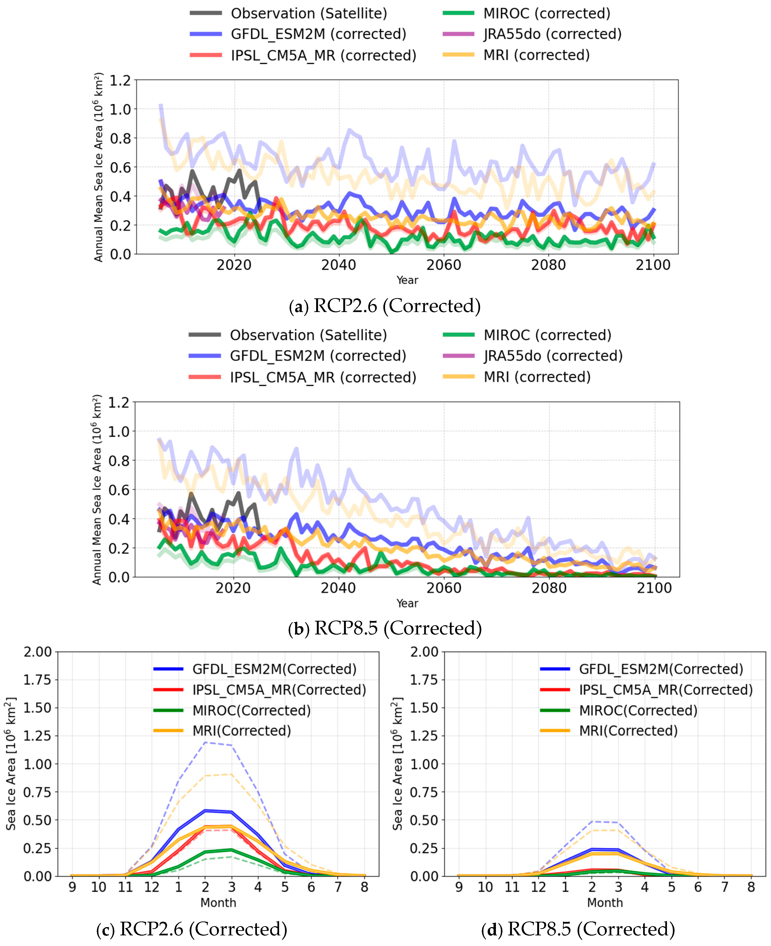 | Model Name | Sea Ice Area [105 (km2)] | RMSE (Original) | Correlation Coefficients | Correction Coefficients | RMSE (Corrected) |