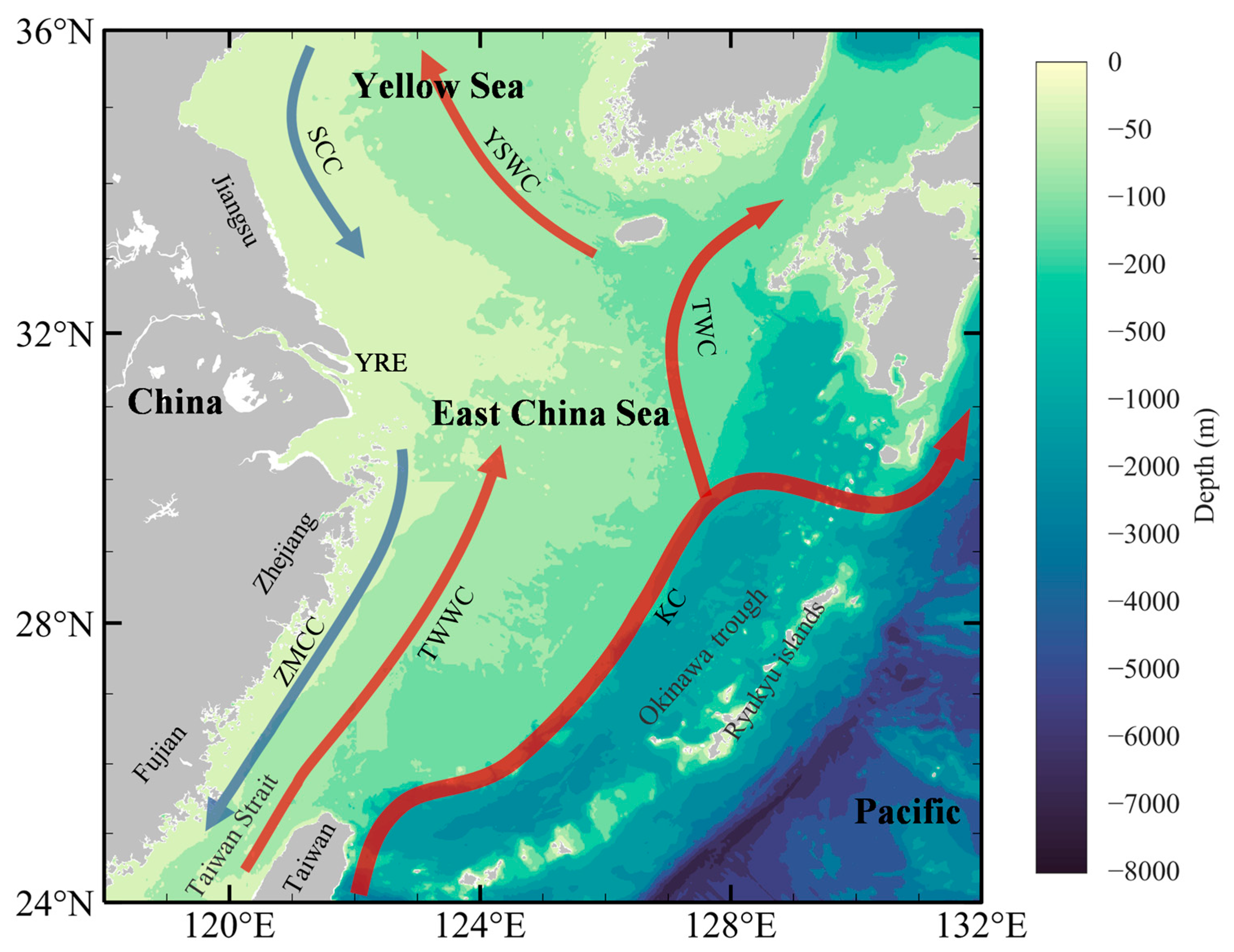 - Yang, H.; Cai, J.; Wu, L.; Guo, H.; Chen, Z.; Jing, Z.; Gan, B. The Intensifying East China Sea Kuroshio and Disappearing Ryukyu Current in a Warming Climate. Geophys. Res. Lett. 2024, 51, e2023GL106944. [Google Scholar] [CrossRef]