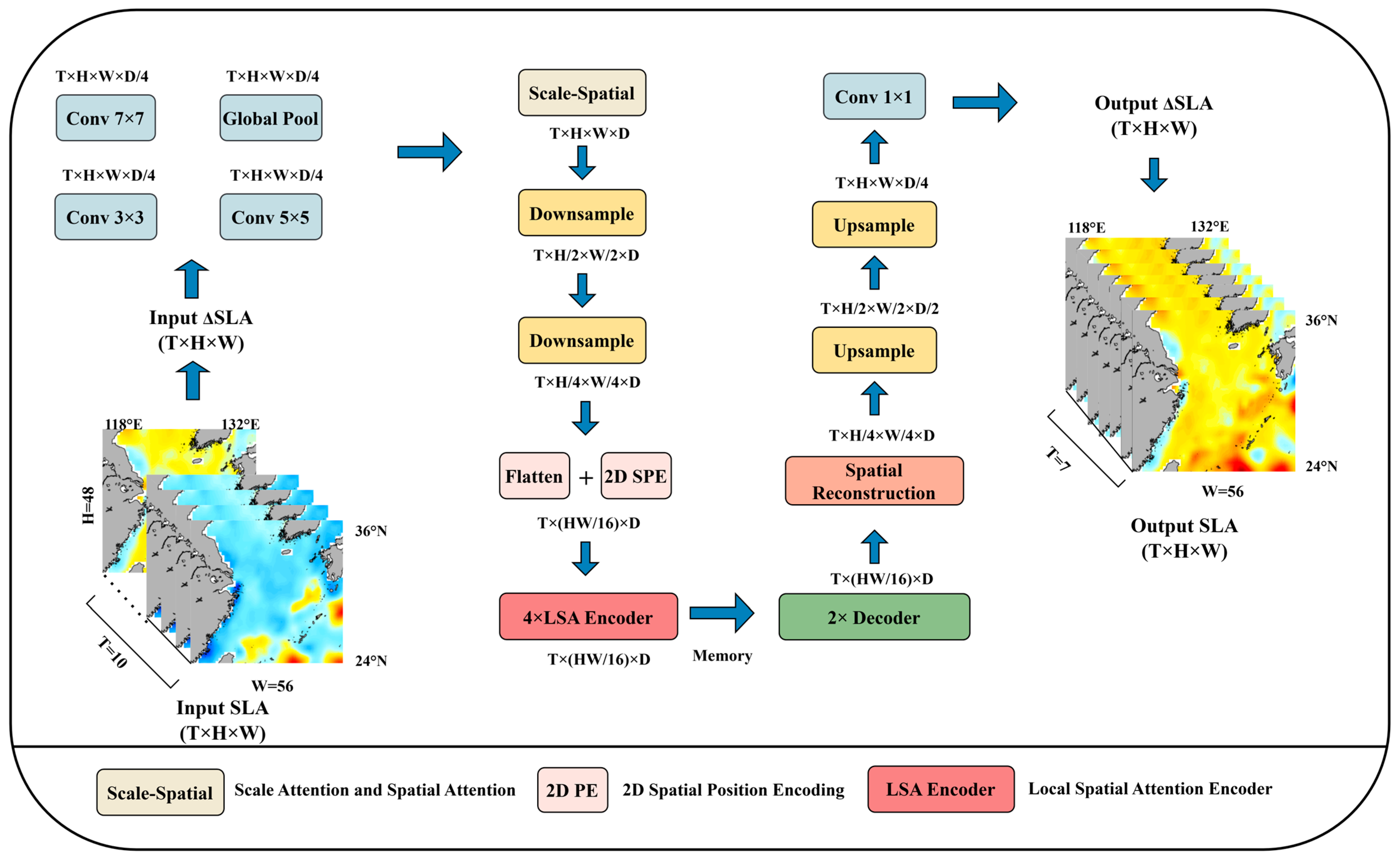 Chicago/Turabian StyleWang, Yuting, Hui Chen, Lifang Jiang, Qiyan Ji, Juan Li, Jianxin Wang, and Guoqing Han. 2026. "Local Spatial Attention Transformer with First-Order Difference for Sea Level Anomaly Field Forecast: A Regional Study in the East China Sea" Journal of Marine Science and Engineering 14, no. 1: 54. https://doi.org/10.3390/jmse14010054