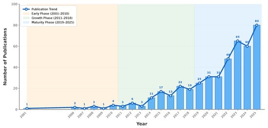 To contextualise the scope and evolution of this field, Figure 1 presents the publication trend for underwater swarm robotics research from 2001 to 2025.