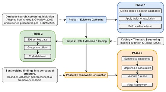 This study adopts a structured narrative review design guided by a transparent and replicable search and screening process. Figure 2 illustrates the three-phase methodological approach, which combines scoping review principles, thematic analysis, and conceptual framework development.
