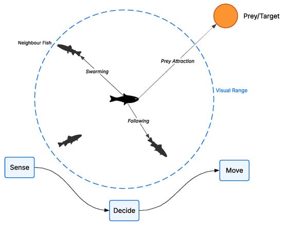 Figure 4 presents a conceptual illustration of the AFSA visual perception and behaviour selection mechanism, showing how artificial fish perceive nearby individuals and environmental stimuli to dynamically select between prey attraction, swarming, and following behaviours.