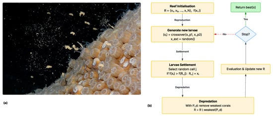 Coral Reef Optimisation (CRO) algorithm: (a) coral spawning illustrating the biological inspiration; (b) flowchart of the CRO process showing reef initialisation, larvae generation and settlement, evaluation, and depredation steps.