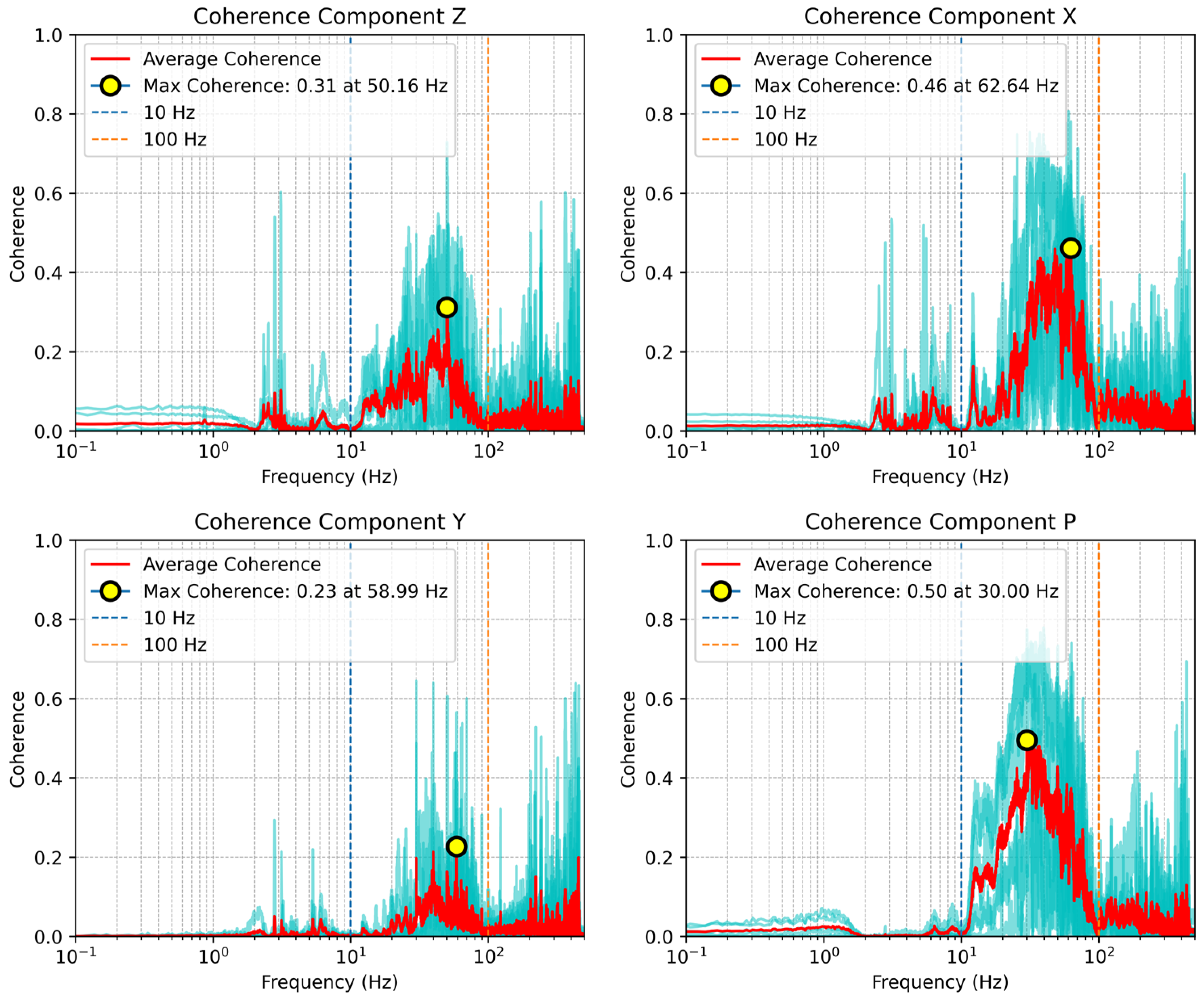 - Remove the mean and trend from seismic records; apply band-pass filtering between 10 and 100 Hz (as determined from PSD–coherence analysis); perform spectral whitening and one-bit normalization.