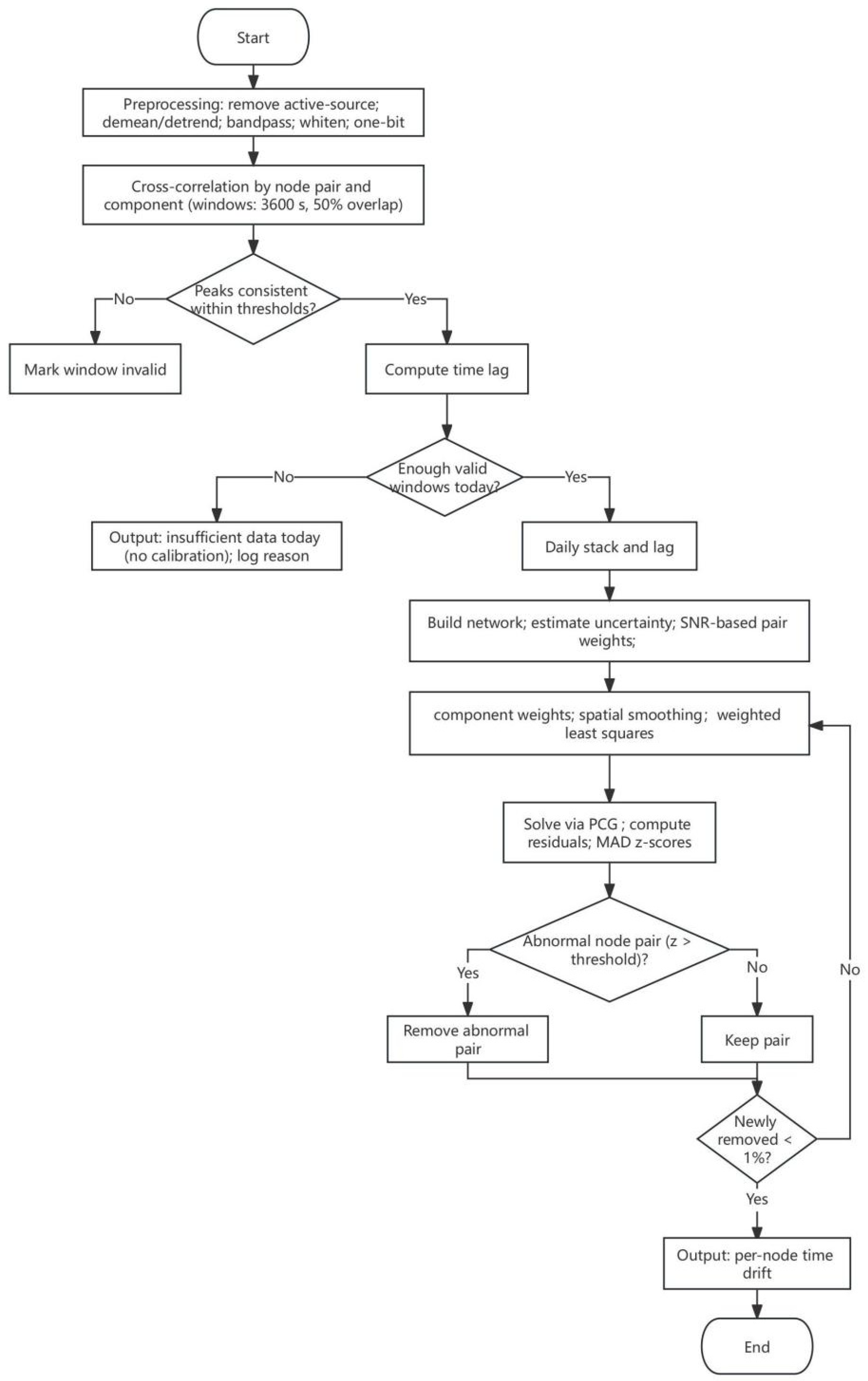- Aggregate all valid adjacent node pairs of the day to form a system of observation equations; assign component weights according to SNR; construct second-order difference operators for each survey segment. Formulate the joint objective function and solve for the daily nodal time shifts using the preconditioned conjugate gradient method.