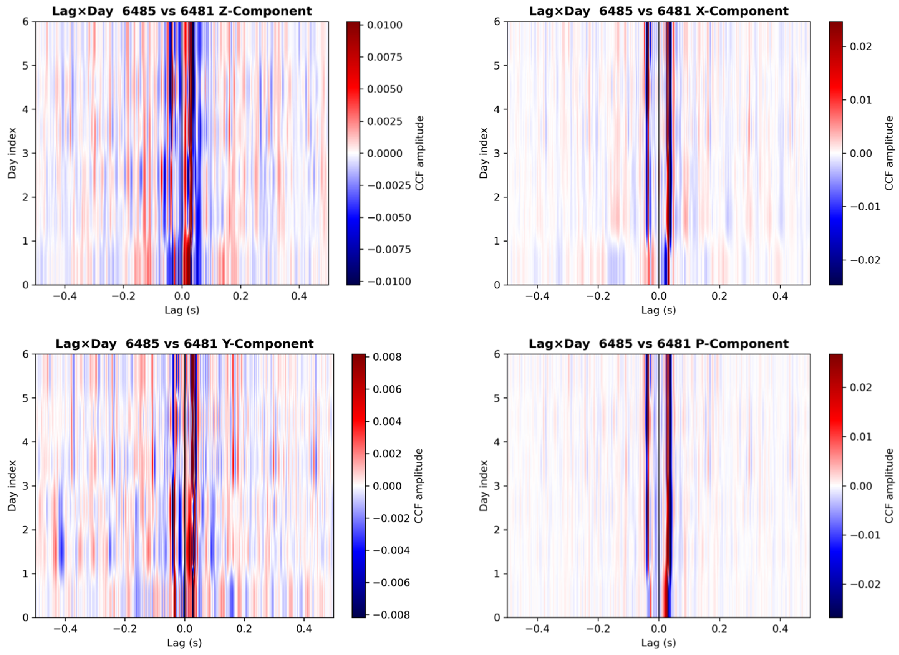 - Segment daily data into 3600 s windows with 50% overlap; for each window and each component, compute cross-correlations between adjacent node pairs and extract the time delays of the dominant peaks on both positive and negative branches.