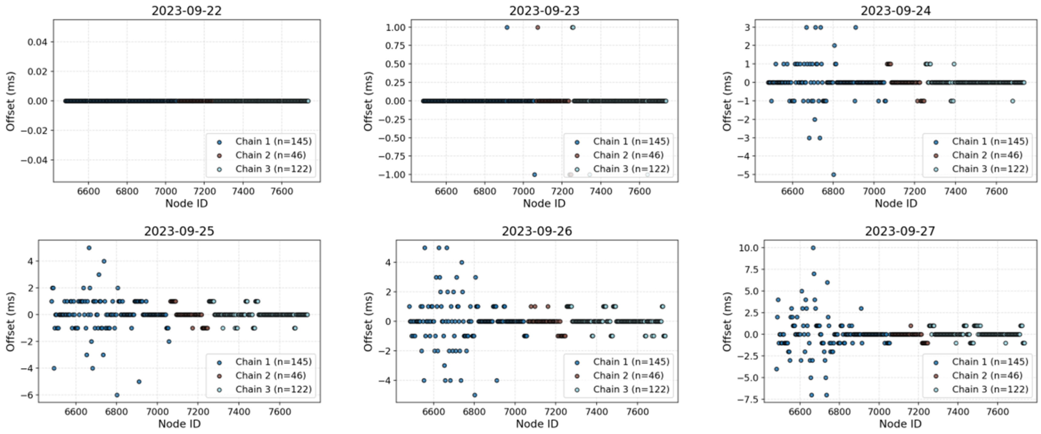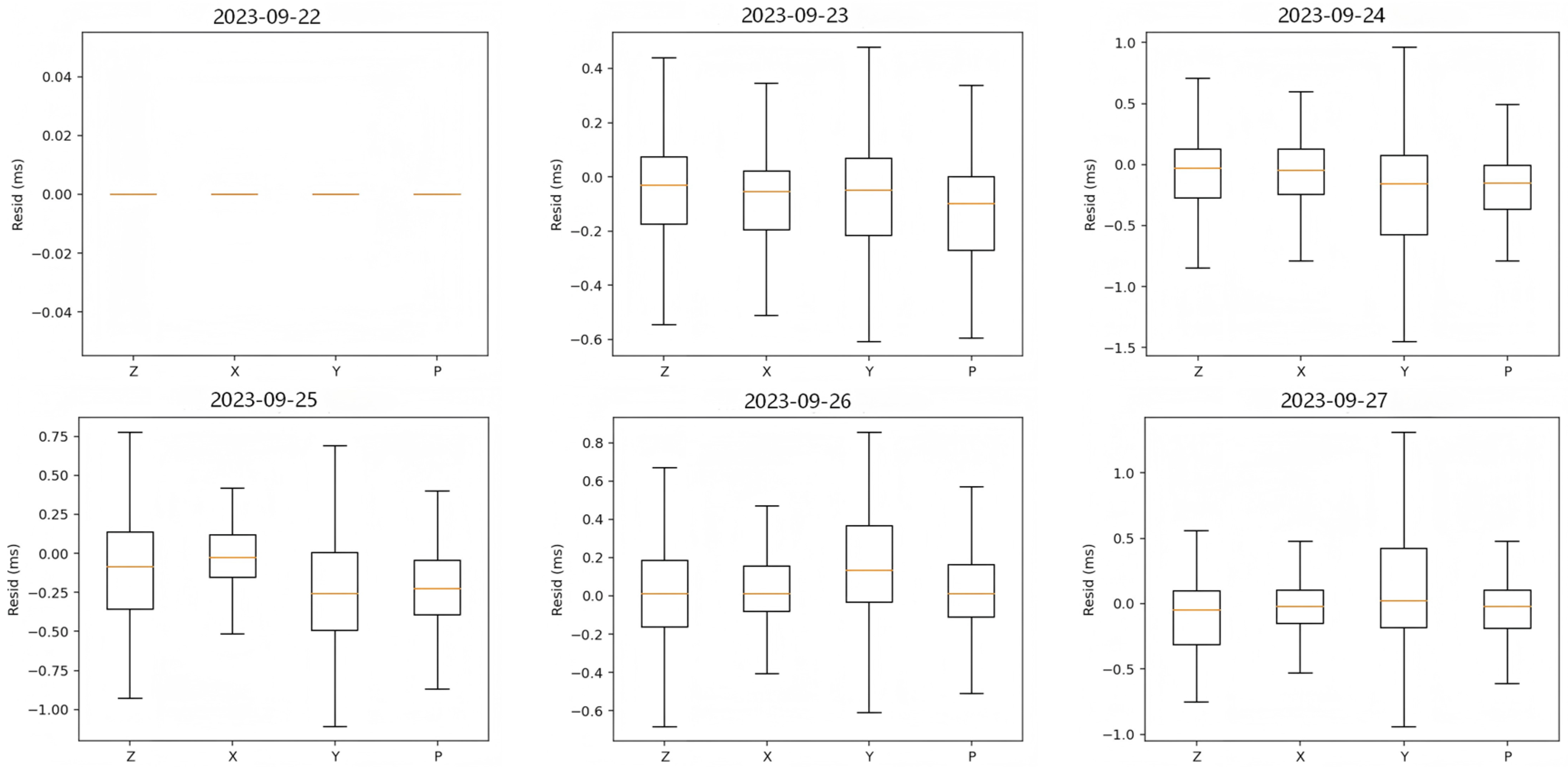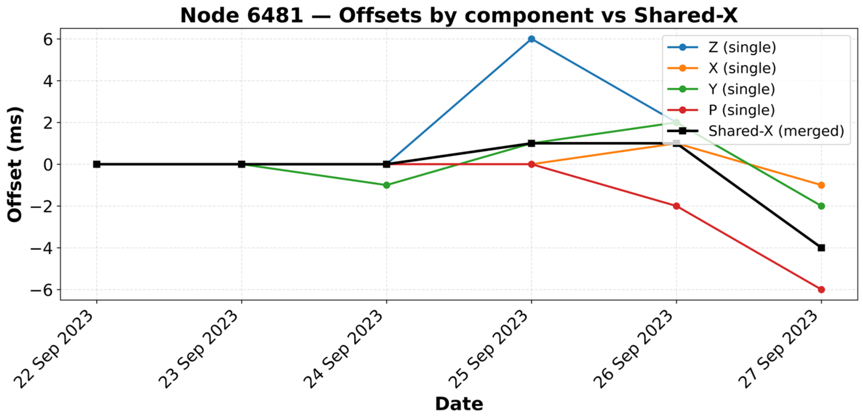 - Node-wise and array-wise drift behavior. Across 315 nodes over six days, daily drifts stay centered near 0 ms for ≥90% of nodes (≈±1–2 ms), but a subset shows gradual growth to 7–10 ms by day six—behavior that the method captures without over-smoothing. For a representative node (6481), single-component outliers (e.g., Z: +6 ms, P: −6 ms on particular days) are attenuated in the four-component fused solution, demonstrating the benefit of component fusion for robustness.