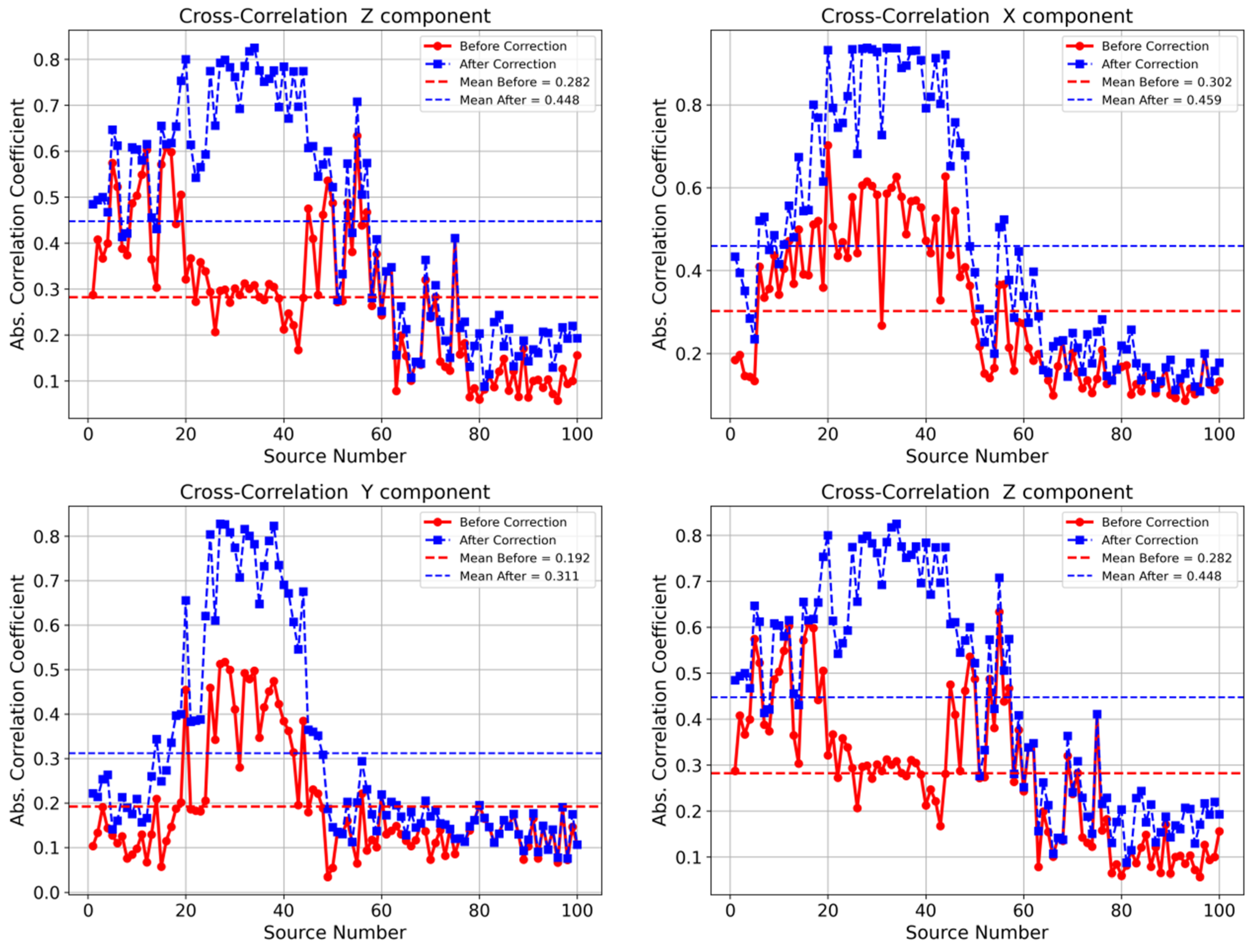 - Shot-gather correlation uplift. After applying fixed ms-level timing corrections implied by the inversion, cross-component correlation increases by about +0.12–+0.19 on average, with some shots improving by ≈+0.6, directly linking the time-shift solution to phase-alignment gains in active-source data.