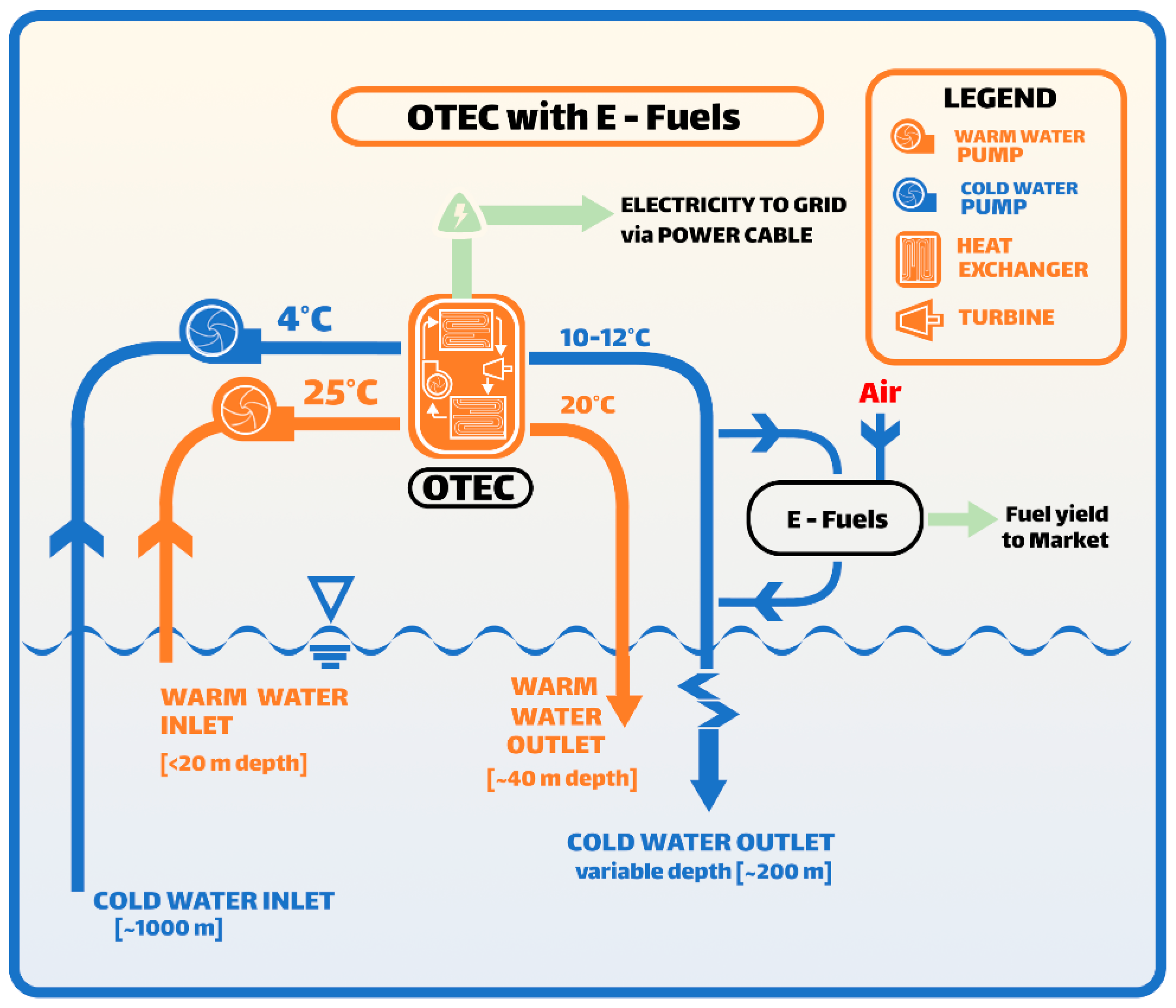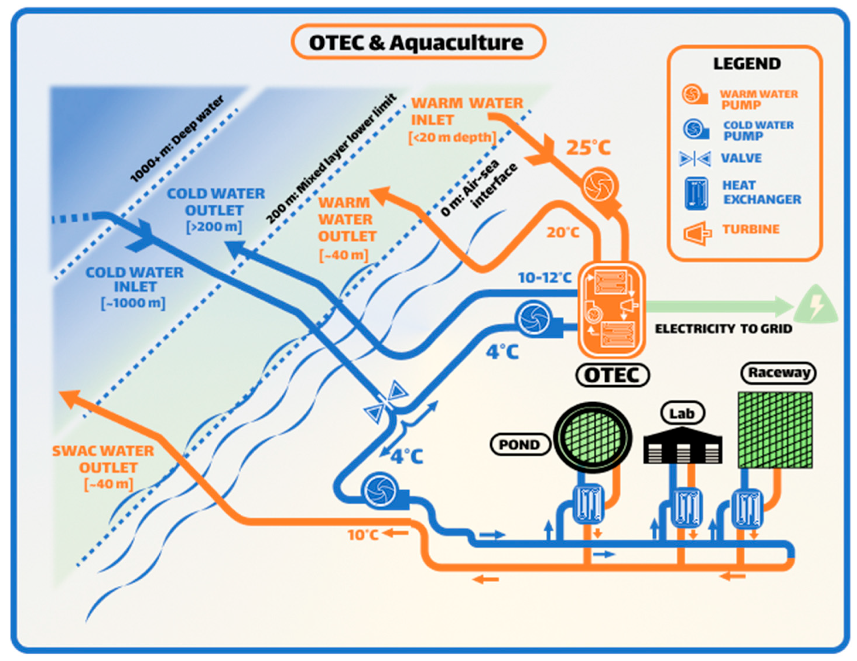 14]. The cold nutrient-rich deep seawater needed for OTEC’s power cycles has many promising byproducts and applications, including SWAC for residential and industrial cooling, support for aquaculture farms (e.g., seaweed, shellfish, and finfish), freshwater from desalination, power to extract critical minerals from seawater, and e-fuels such as ammonia and hydrogen. These value-added products and services have the potential to lower the overall cost of power production for an OTEC system, assisting in bringing the necessary capital to establish this as a widespread renewable energy source from the sea. While few studies have examined purpose-built or multi-use OTEC systems, there are examples such as the use of cold deep water associated with the 100 kW OTEC plant on Kumejima Island in Okinawa, Japan, for enhancing aquaculture [
