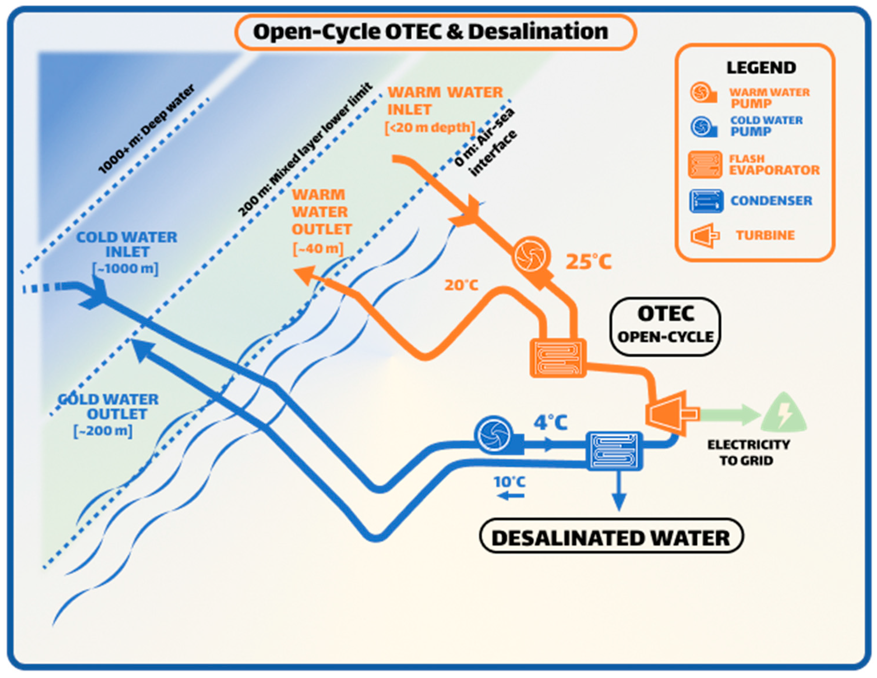 7]. Open-cycle OTEC, while less efficient than closed-cycle, uses seawater as the working fluid and can be paired with a desalination system to produce freshwater [