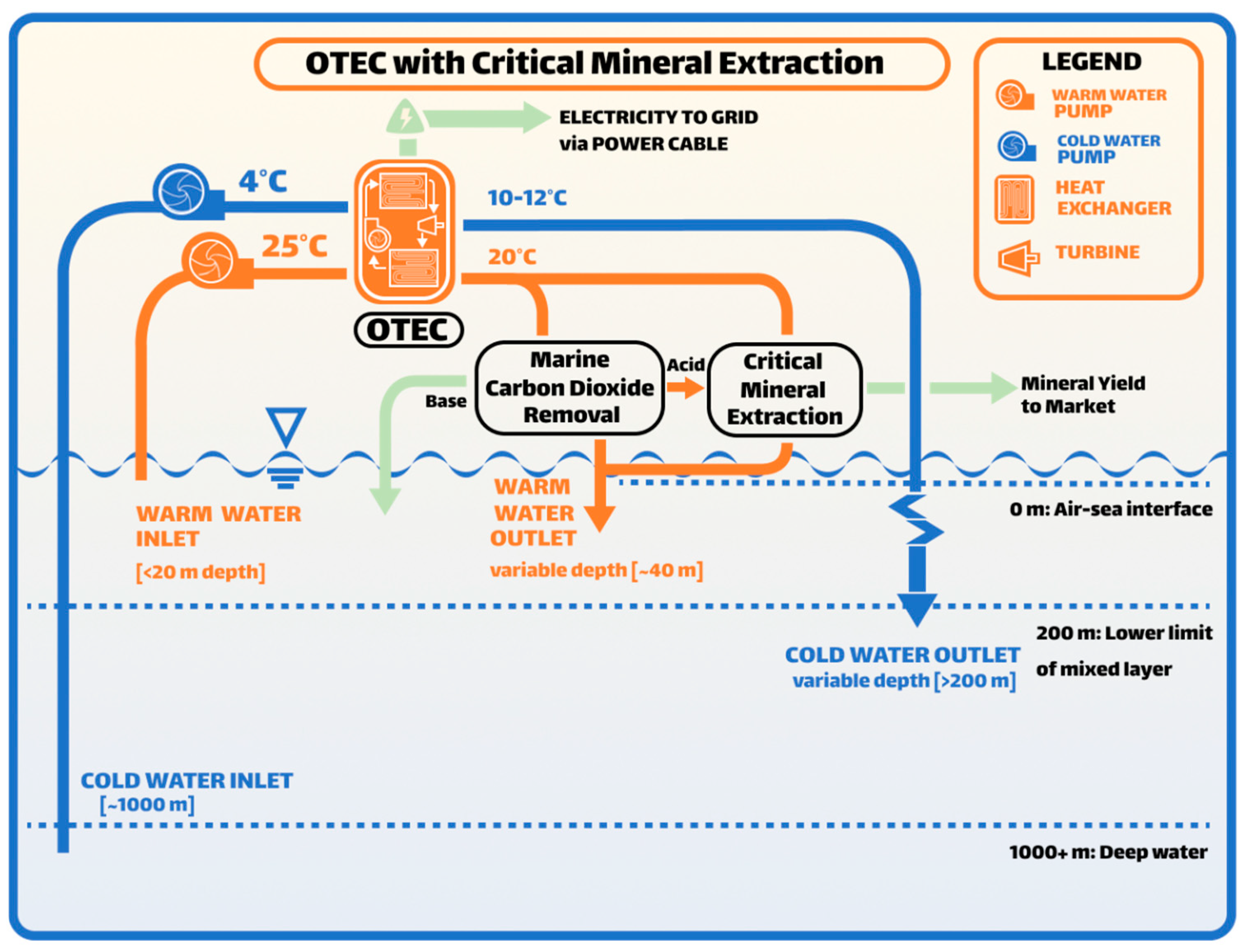 All metals and earth minerals found on land are present in dilute forms in the ocean, dissolved in seawater. Mining these elements from seawater requires the movement of large volumes of seawater, which has made their recovery prohibitively expensive in terms of energy using current technology. However, the large volumes of seawater moved as part of OTEC processes could help to initiate critical mineral recovery, using efficient, cost-effective absorbents that scavenge specific elements. Further examination of the critical mineral extraction in conjunction with OTEC can be found in [