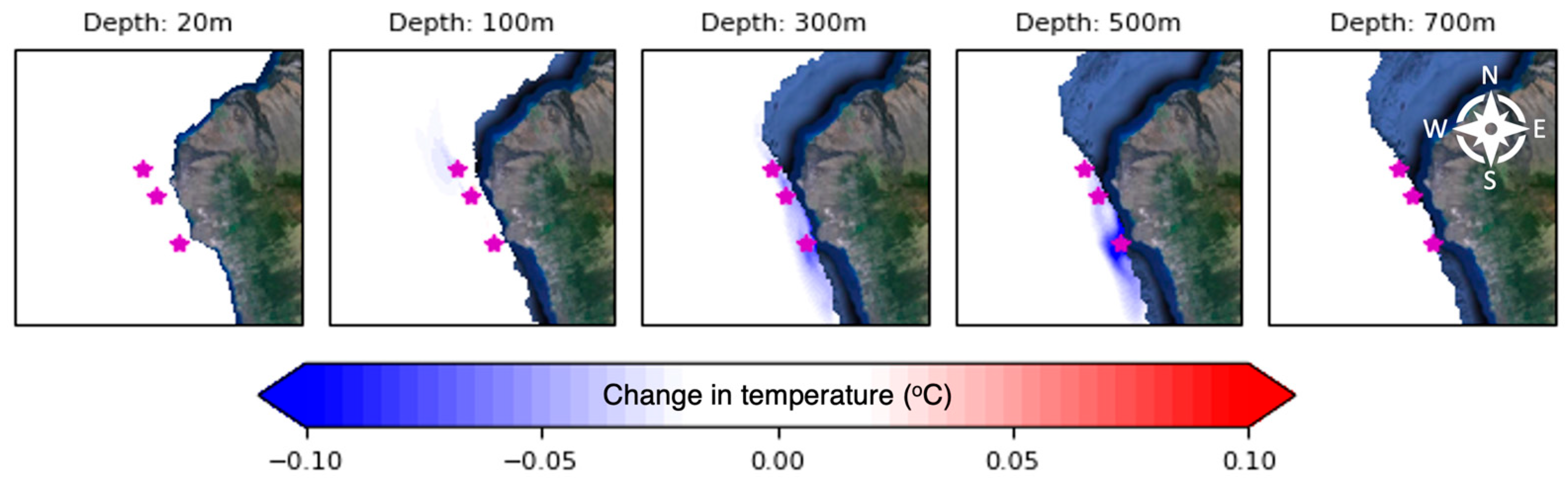 Figure 11 shows the differential in temperature of water (cold water return scenarios minus baseline condition) found at five different depths, due to the addition of the discharge water. The 20 m depth shows no change in temperature as the discharge is deeper and the discharge water is denser than the near-surface water. At 100 m depth (the discharge depth), a small but extremely weak northward plume of colder water is seen in the model, indicating the negligible cold water effect on the ambient water. At 300 m and 500 m depth, a southward plume is clearly observed but the maximum change in temperature is less than 0.1 °C. By 700 m depth, the plume is not observed, indicating that the discharge water is being assimilated at water depths between 500 and 700 m. All changes in temperature are 0.1 °C or less from ambient water. A change in temperature of 3 °C is commonly considered to be the cause of instability in the water column [