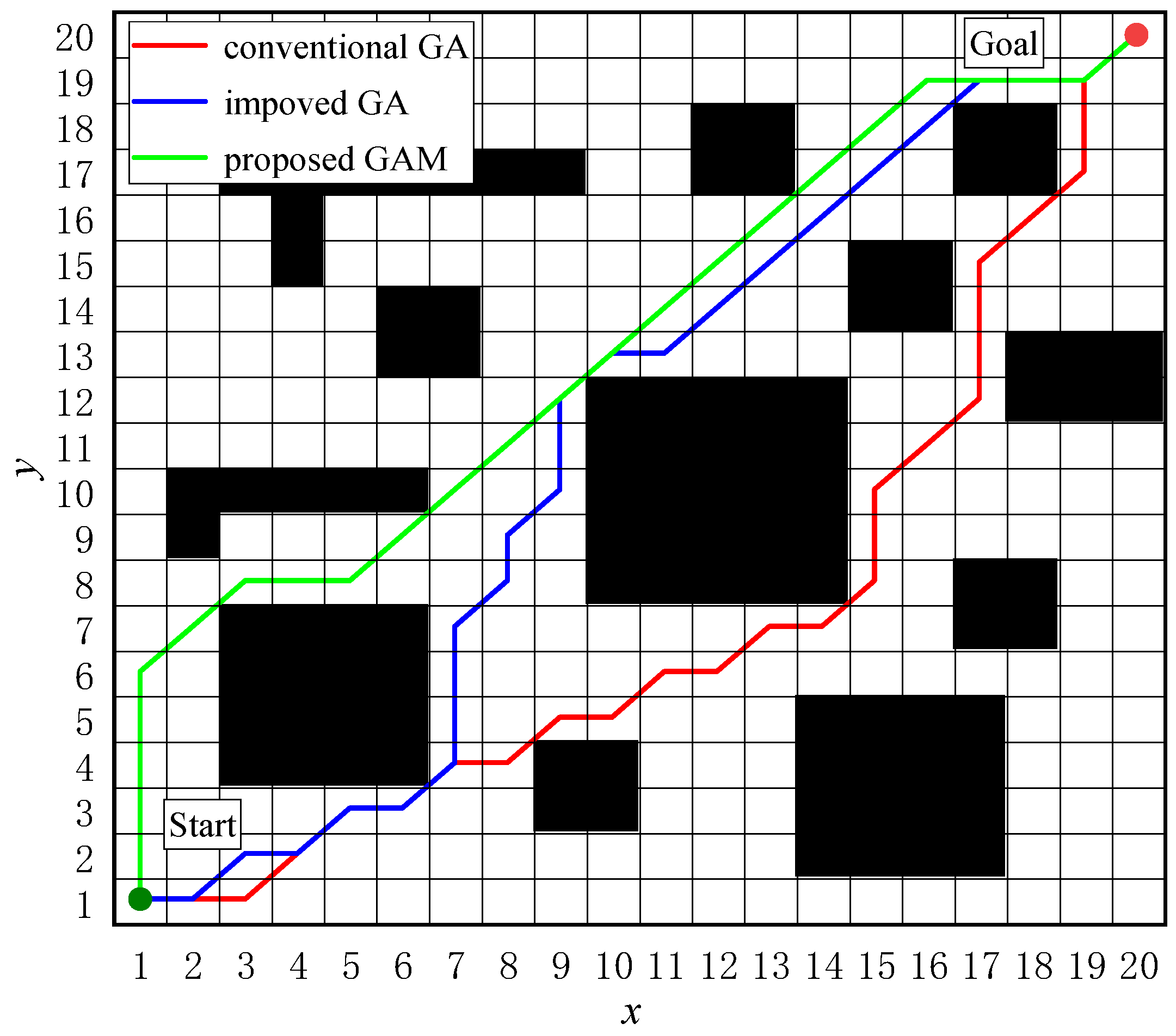 This paper conducted a comparative study of the GAM algorithm against both the traditional GA and an improved GA on 20 × 20 and 30 × 30 grid maps.